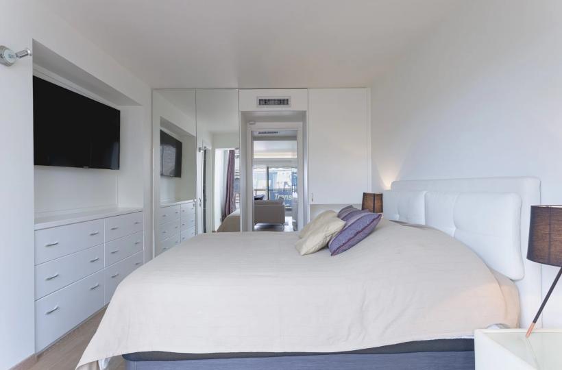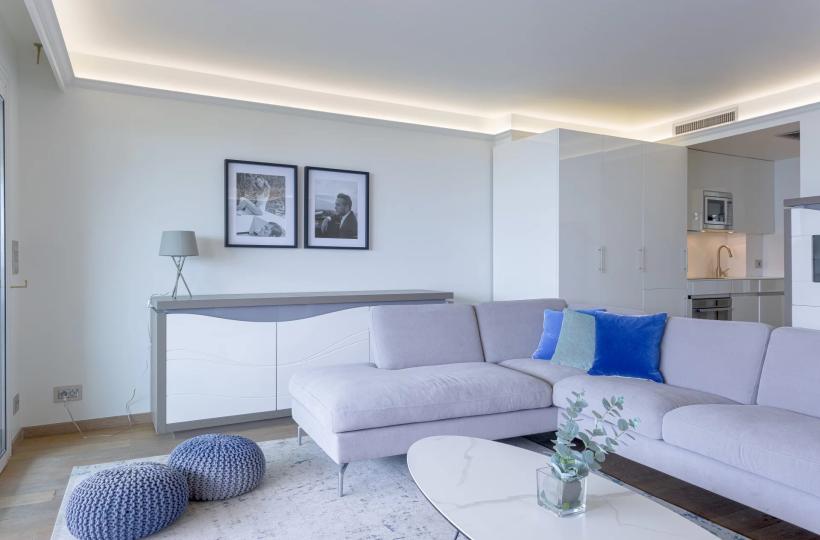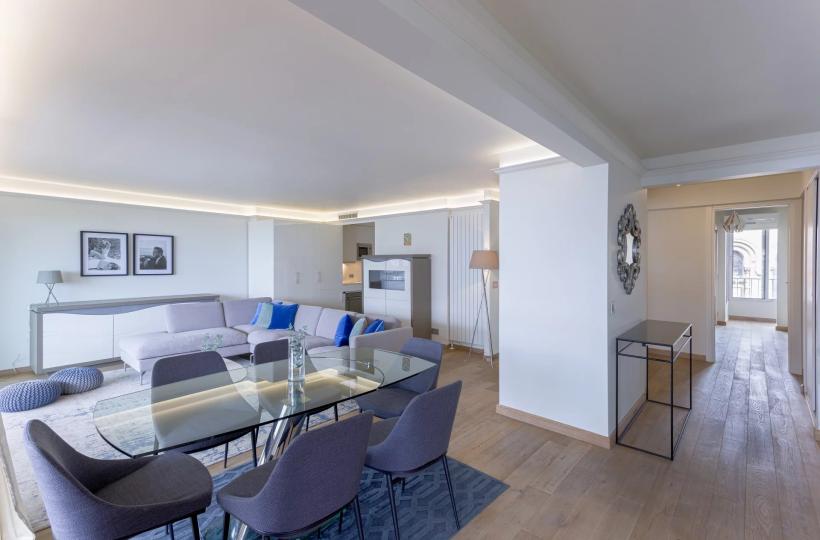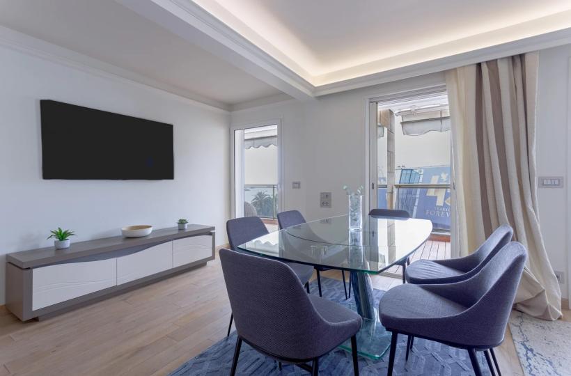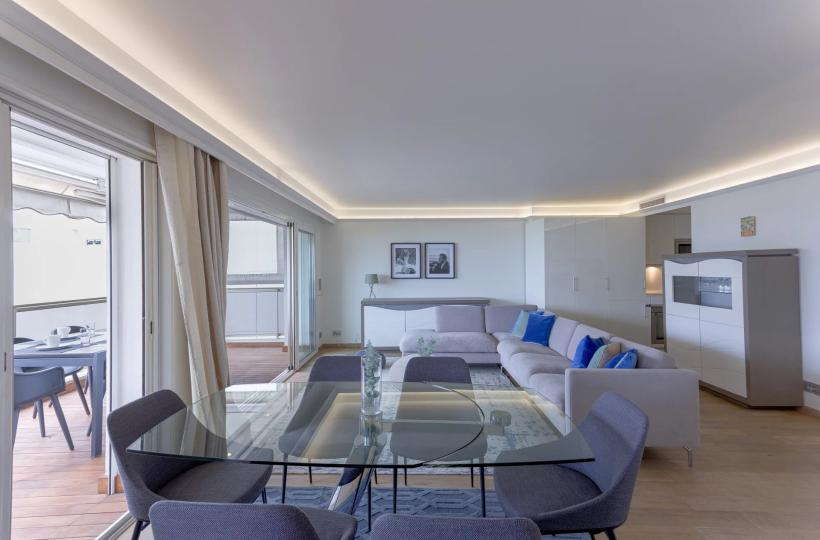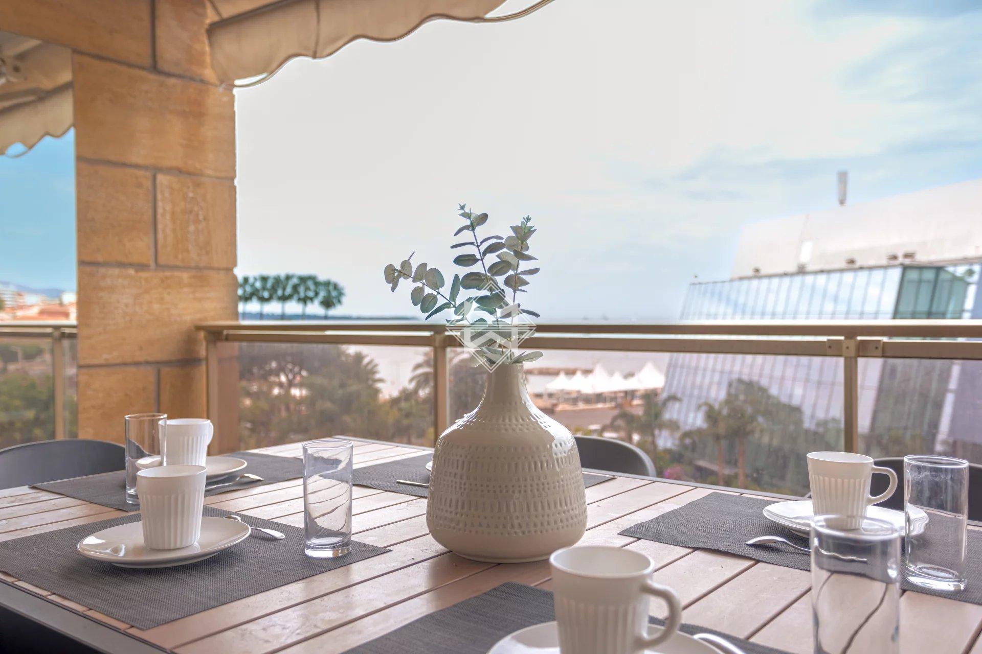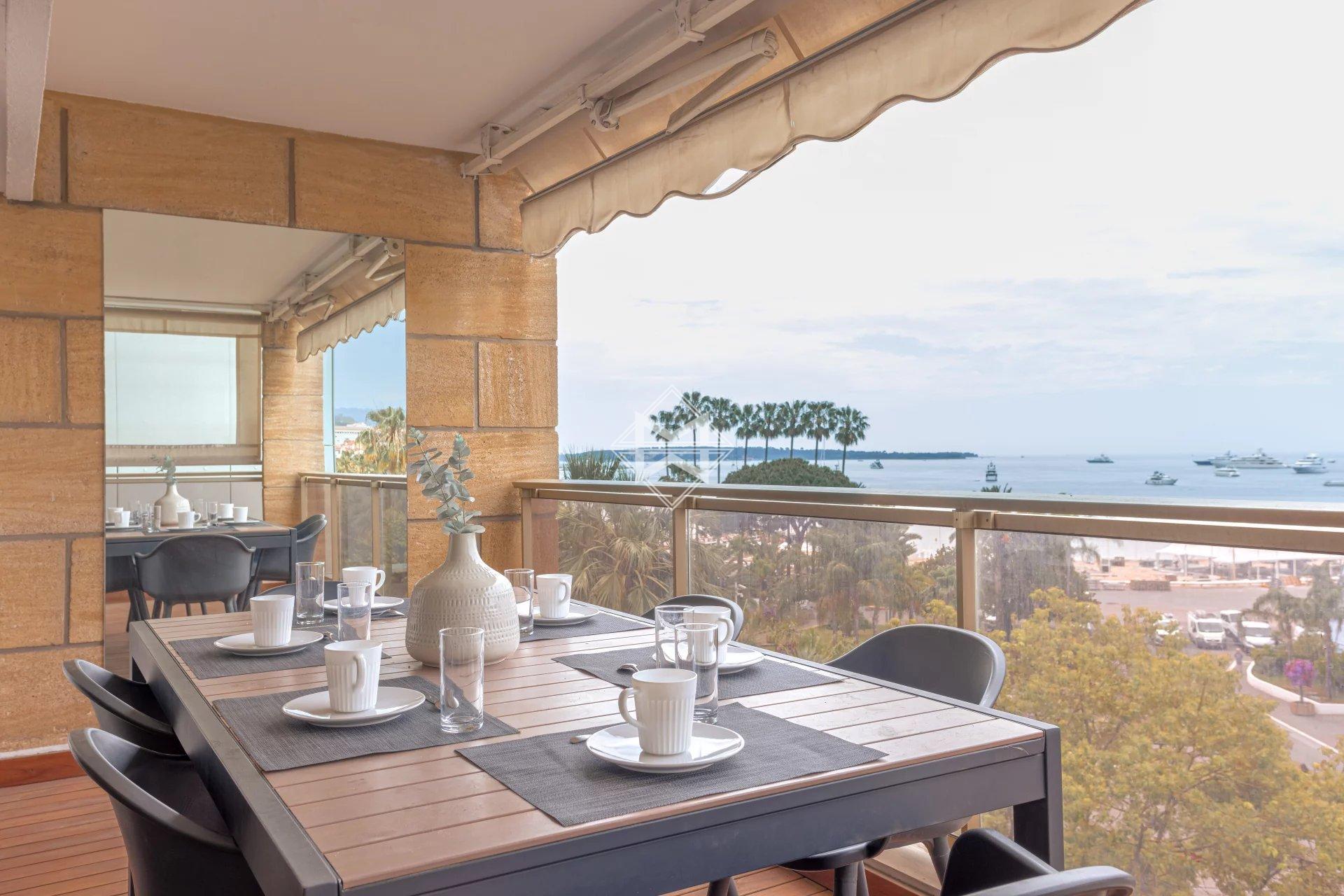 Located on the 5th floor of a luxury residence, this recently renovated 112sqm prestige flat boasts uninterrupted views of the famous red carpet of the Palais des Festivals and the sea.