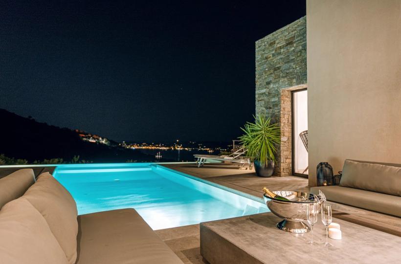 The villa on a terraced plot of 2545 sqm beautifully landscaped and overlooking the bay, with a heated infinity pool