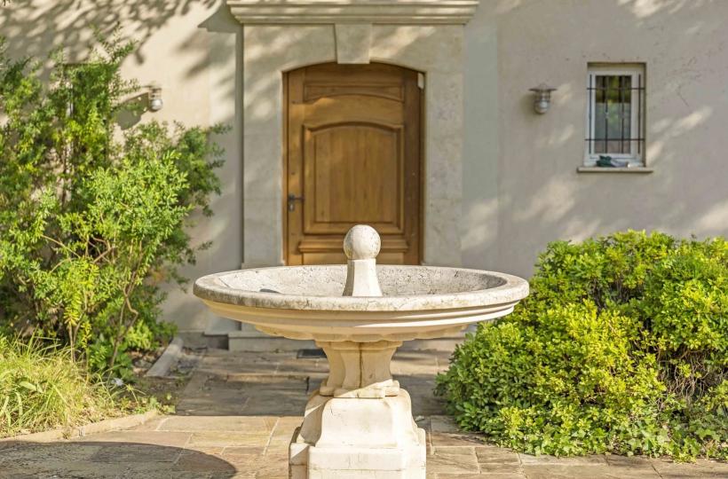 Outside, a large 12-meter swimming pool enhances the garden, complete with an outdoor shower and a fully equipped pool house that can accommodate up to 12 guests. A lovely fountain evokes the Art Deco aesthetic, while vibrant bougainvillea climb along the main entrance façade.