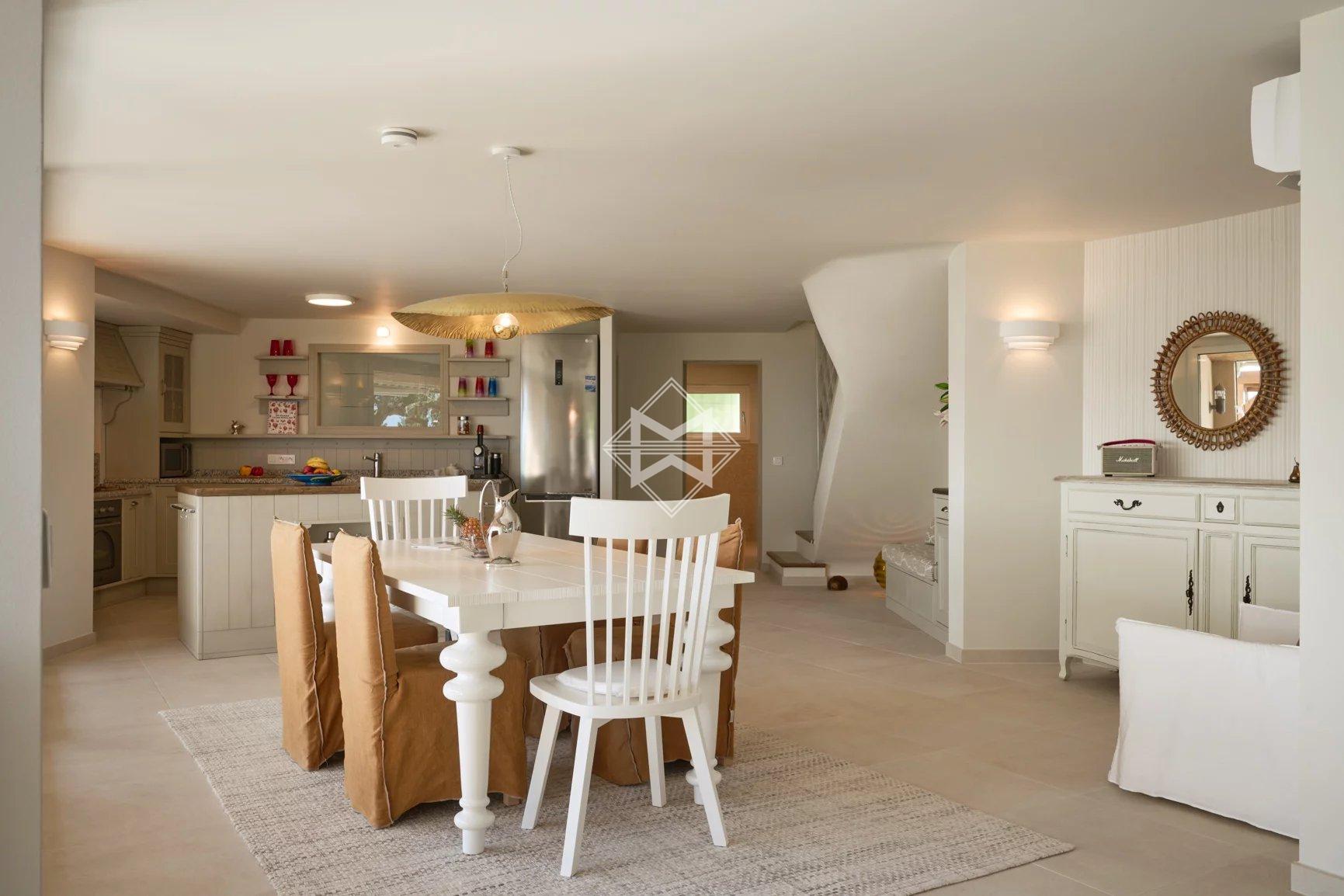 Outdoors, a spacious wooden-decked terrace, a large swimming pool, a pétanque court, and a ping-pong table offer a variety of leisure activities. The lush, Mediterranean-style landscaped garden spans approximately 2,500 sqm. Nestled in the heights of Gigaro and just moments from the beaches of Sylvabelle and Héraclée, this exceptional property enjoys absolute tranquillity in an idyllic setting.