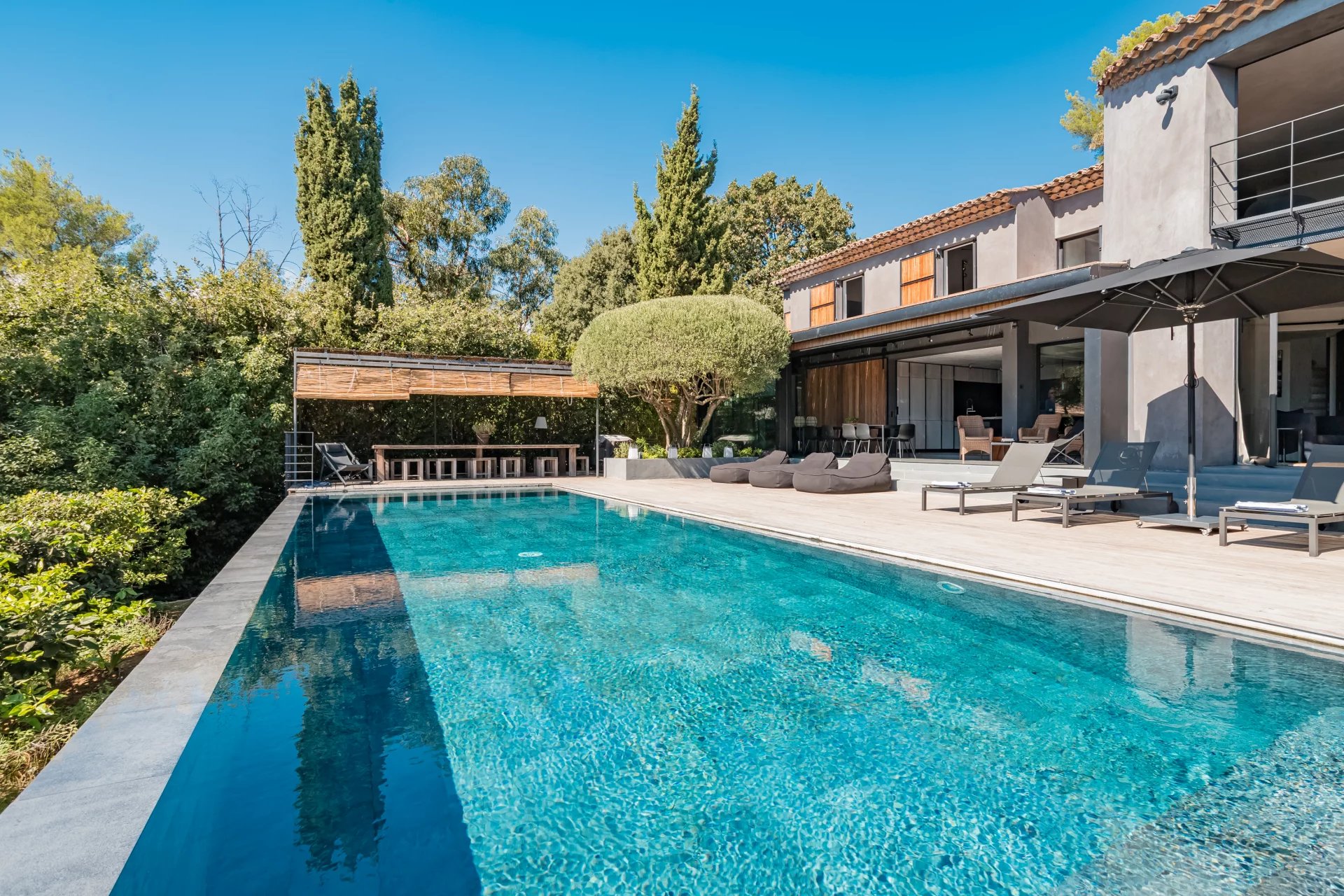 The property features six en-suite bedrooms, including one independent suite, providing optimal comfort to welcome up to 12 guests. A spacious and bright living room allows for indoor relaxation in white tones, while outside, you can enjoy a heated infinity pool, a jacuzzi, and a pétanque court. Thought of as a Venitian palace, this property offers a haven of calm and serenity, with its central patio: a perfect retreat for weddings, honeymoons, birthday celebrations or family gatherings.