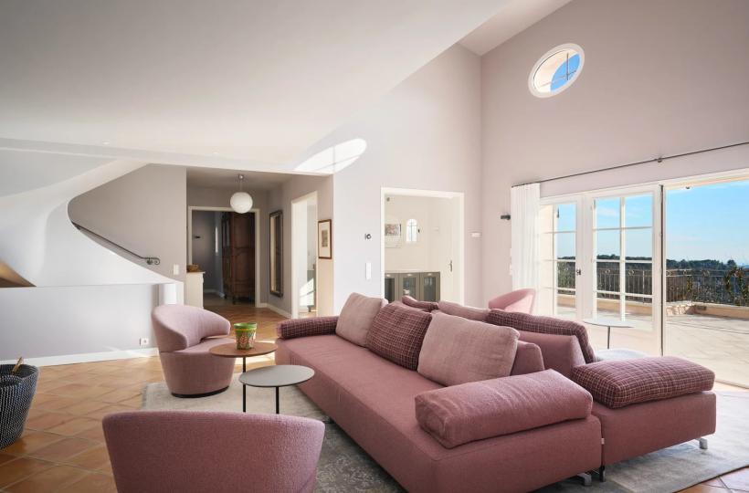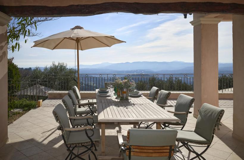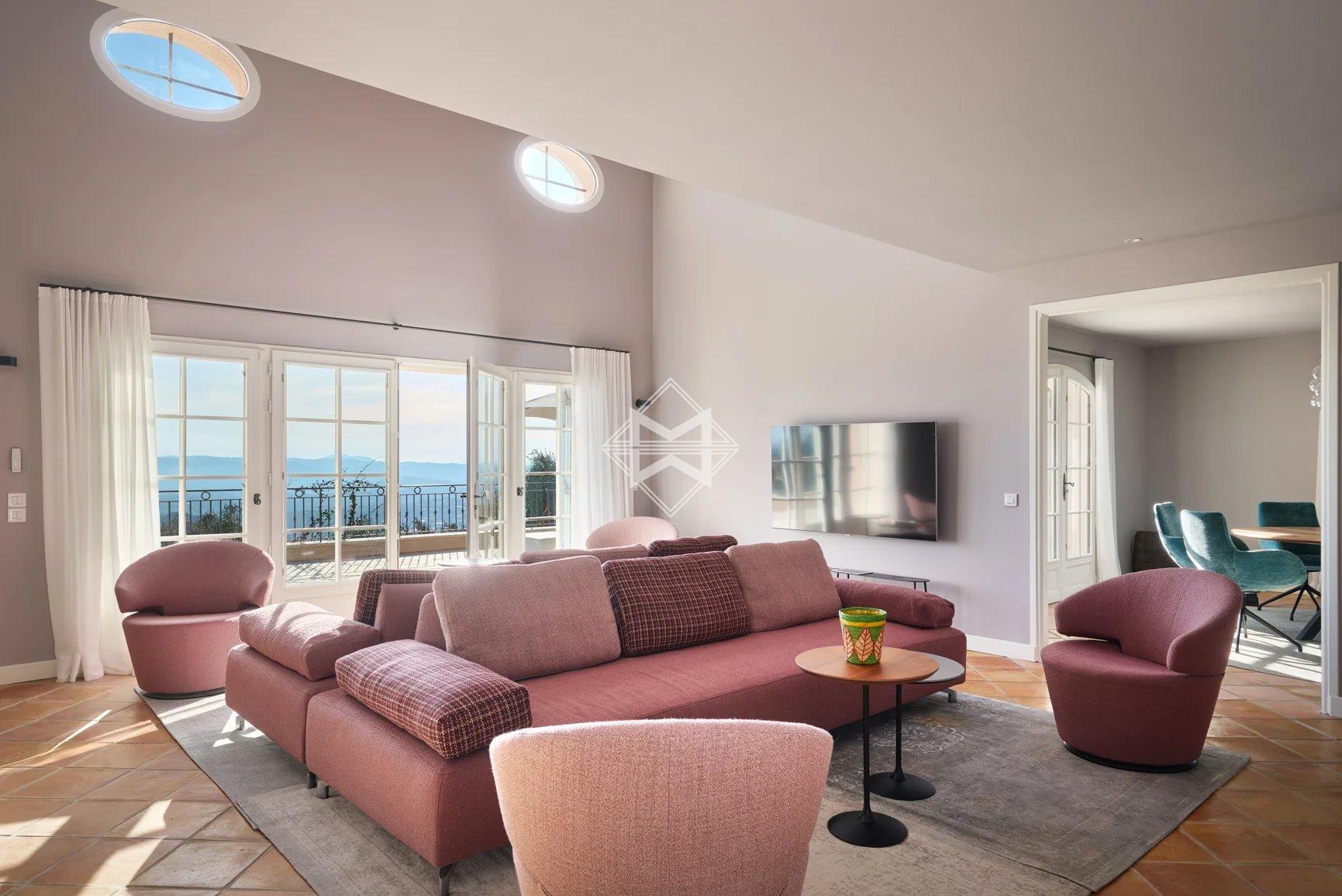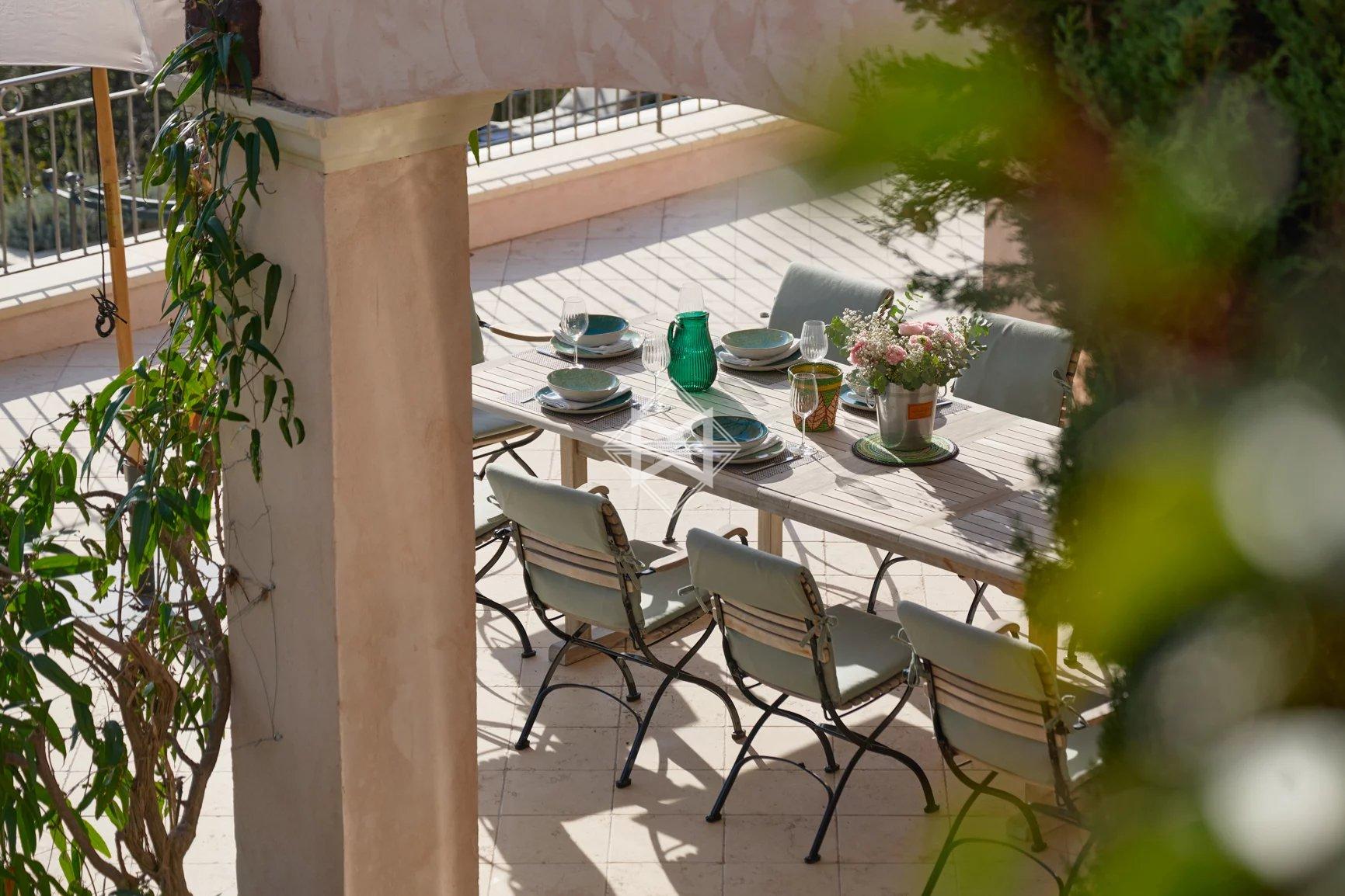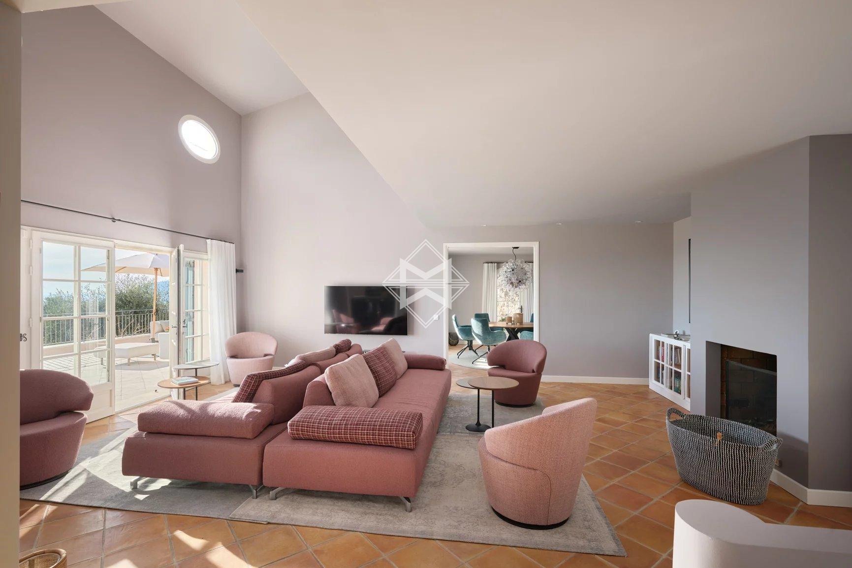 Perched on the hills of Chateauneuf and facing full South, this delightful Provençal villa offers exceptional sea views from Cap d'Antibes to Théoule.