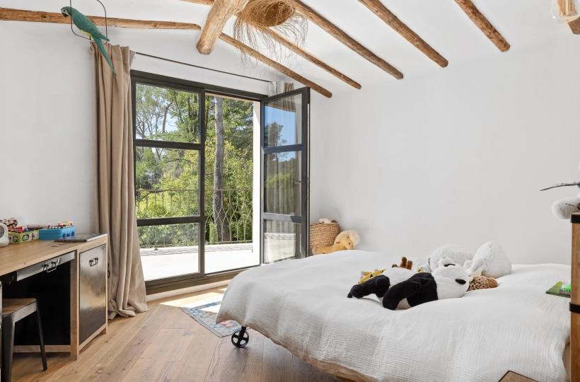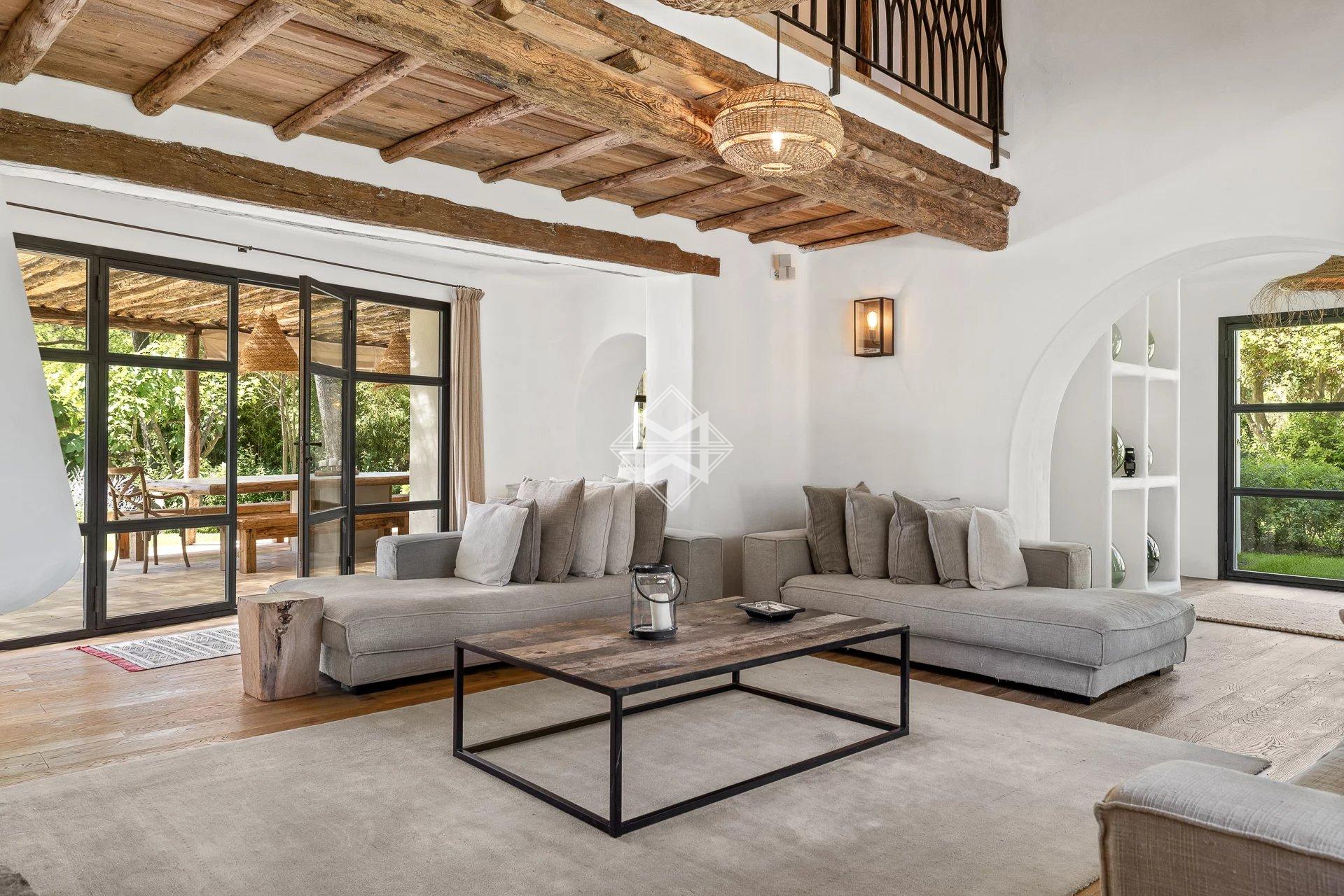 This property is located in one of Mougins' most sought-after neighborhoods, in a very residential area offering beautiful views of the bordering green hills. This magnificent residence has been completely restored in a warm, typically Mediterranean style, with stone floors, wood panelling and parquet flooring with a raw, natural look.