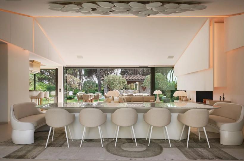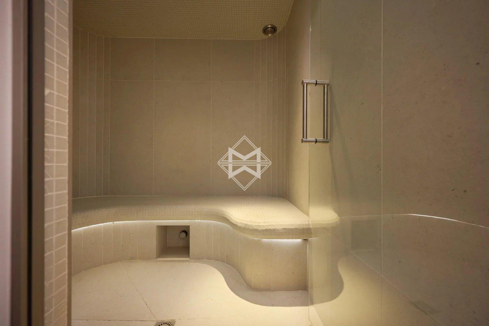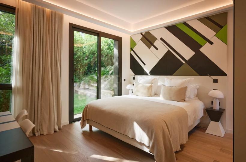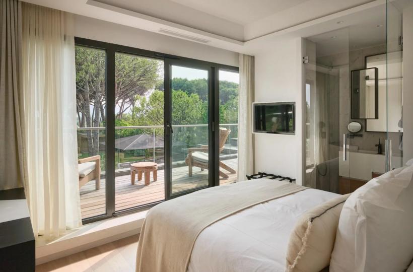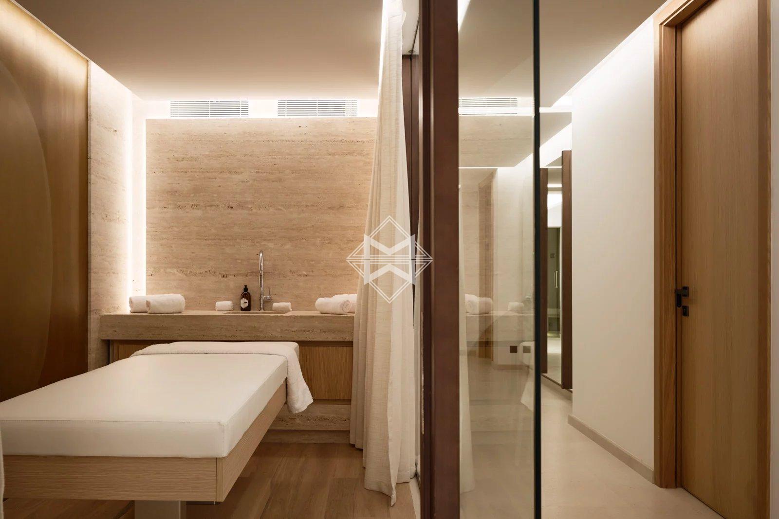 This villa features five en-suite bedrooms, including one upstairs with its own private balcony. The lower level is dedicated to wellness, with a massage room, a gym, a hammam, and two additional staff bedrooms.