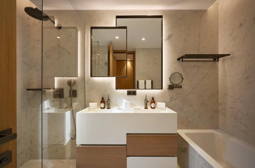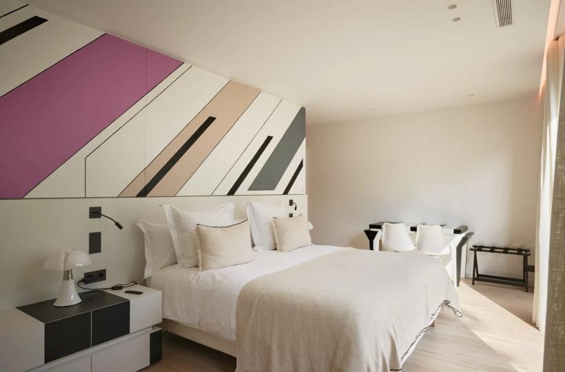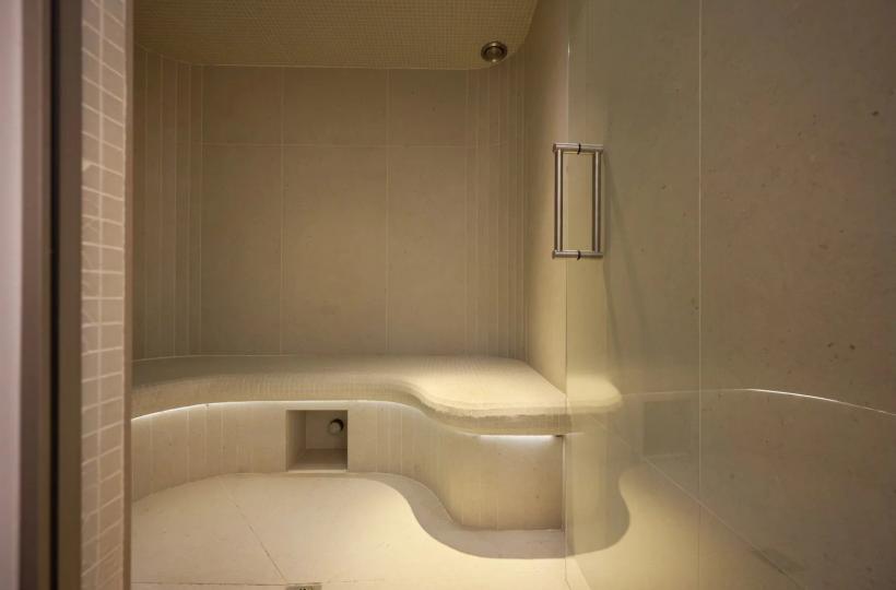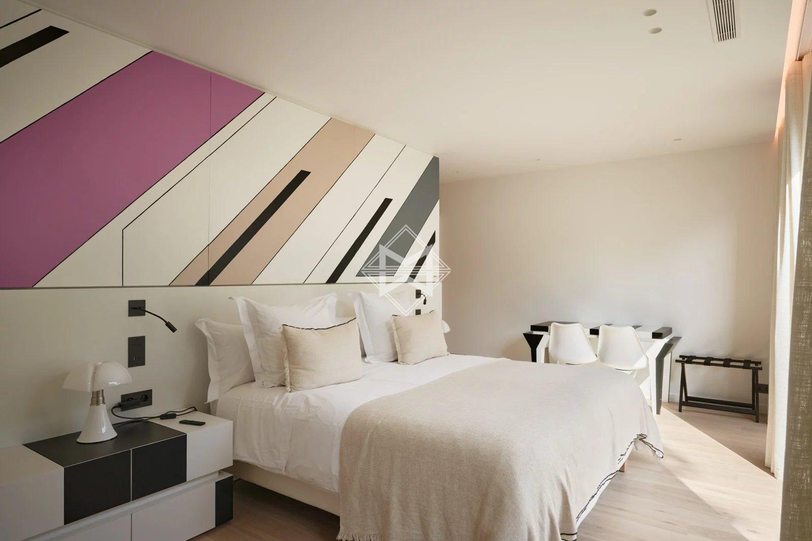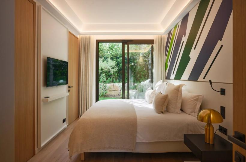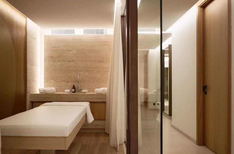 This villa features five en-suite bedrooms, including one upstairs with its own private balcony. The lower level is dedicated to wellness, with a massage room, a gym, a hammam, and two additional staff bedrooms.
