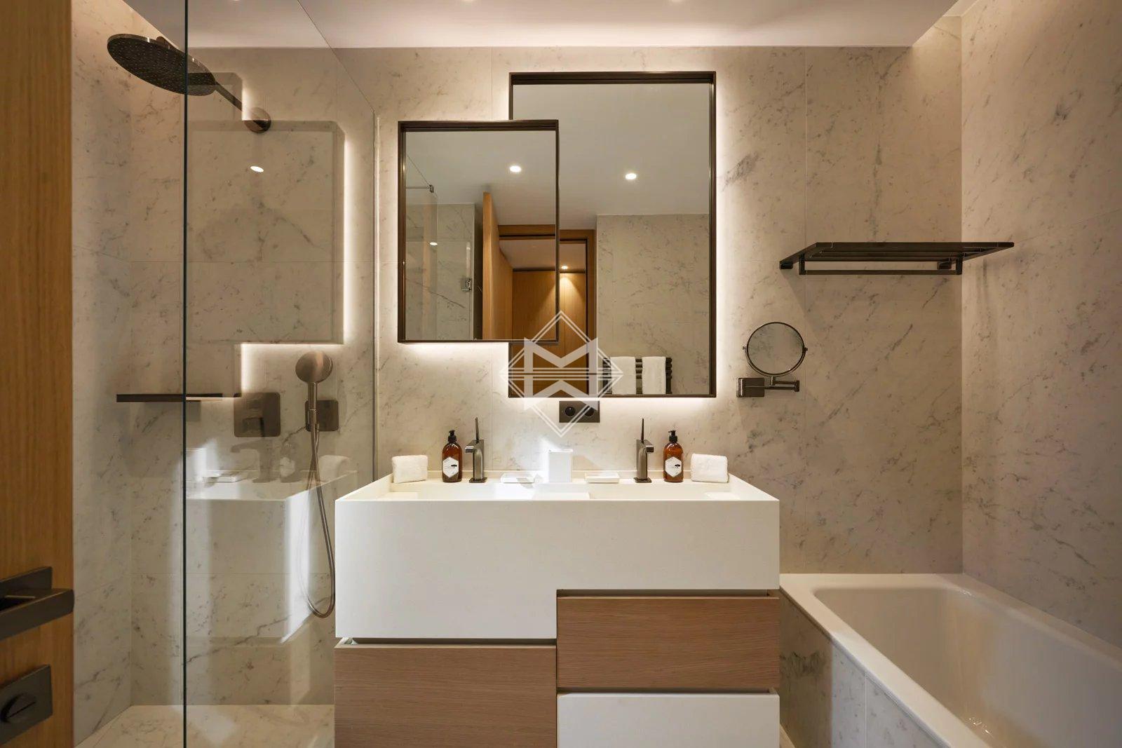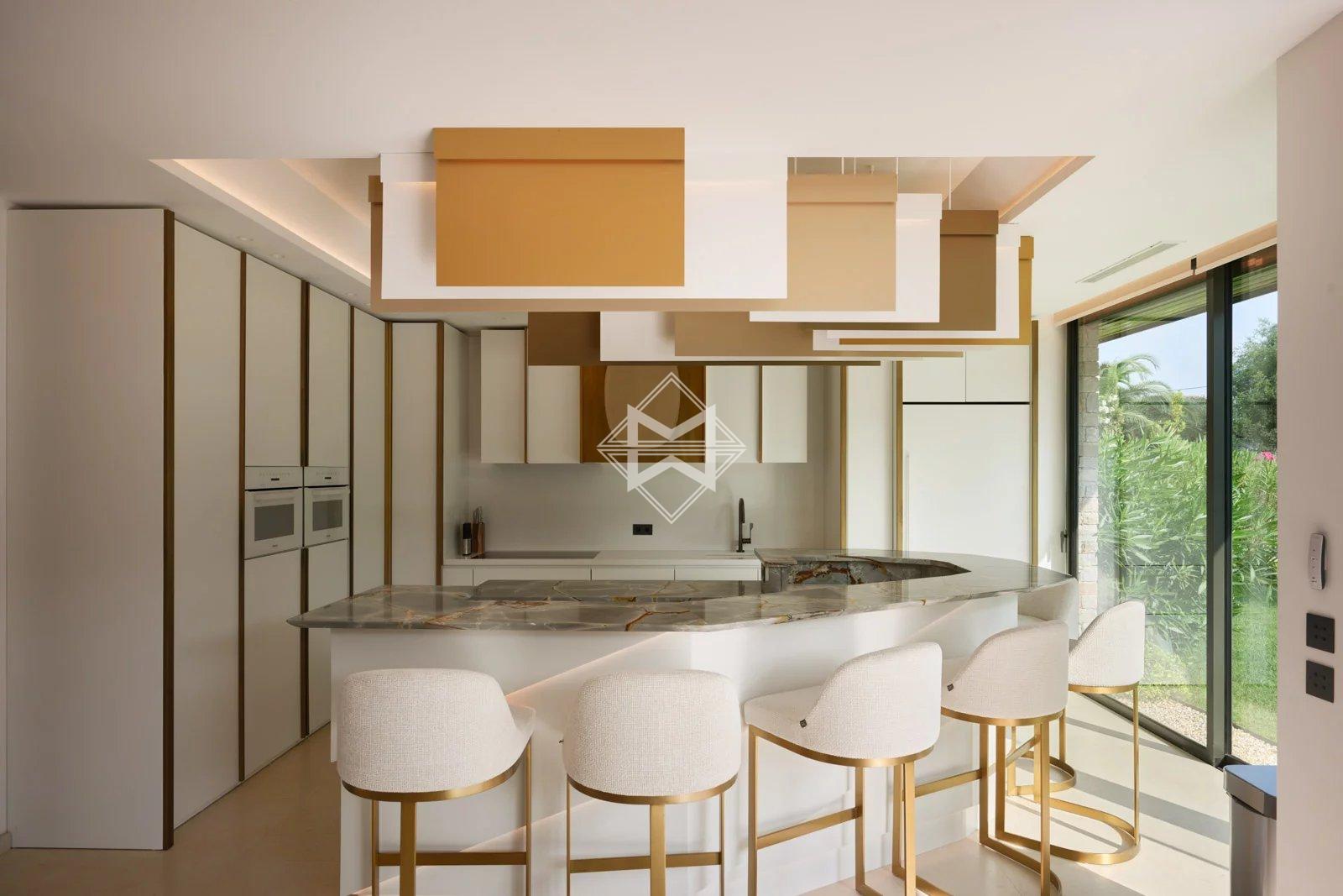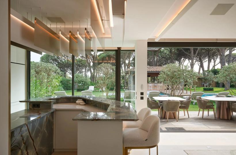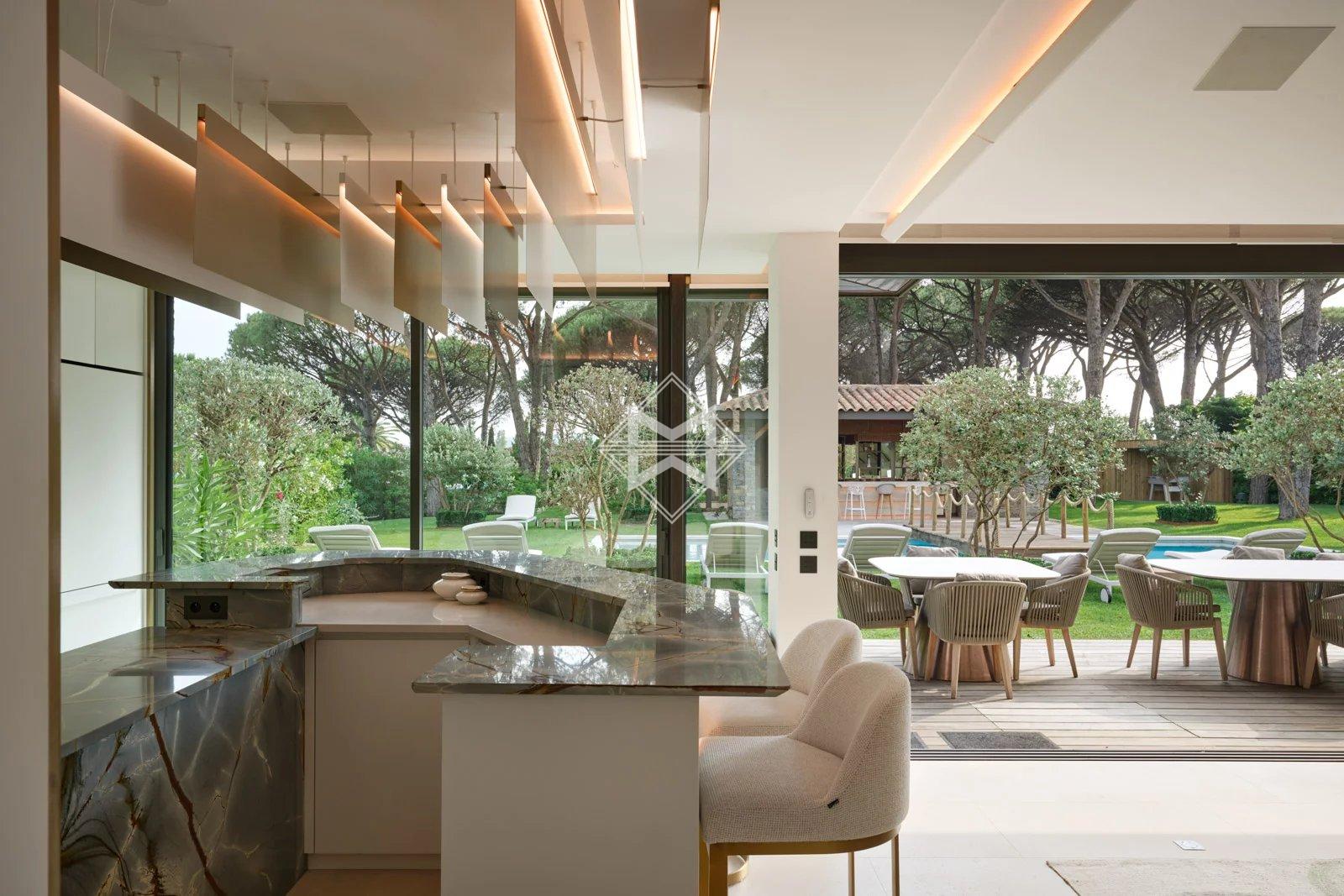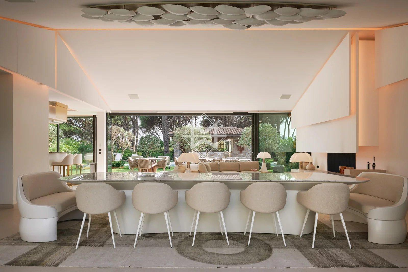 Upon entering, you discover a light-filled, open-plan living space, with a living room and dining room opening onto the swimming pool on one side and a verdant patio on the other—a true light well at the heart of the home. The magnificent open-plan kitchen, fully equipped and designed with a high-end aesthetic, blends seamlessly into this welcoming and elegant space.