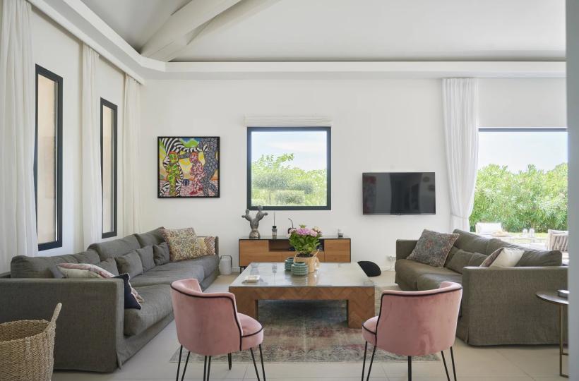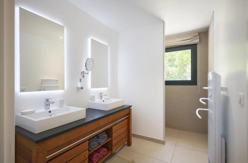 The villa develops a living space of 265 m2, including a beautiful living room and 5 suites. There is also a double garage and a summer kitchen.