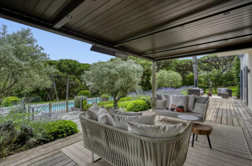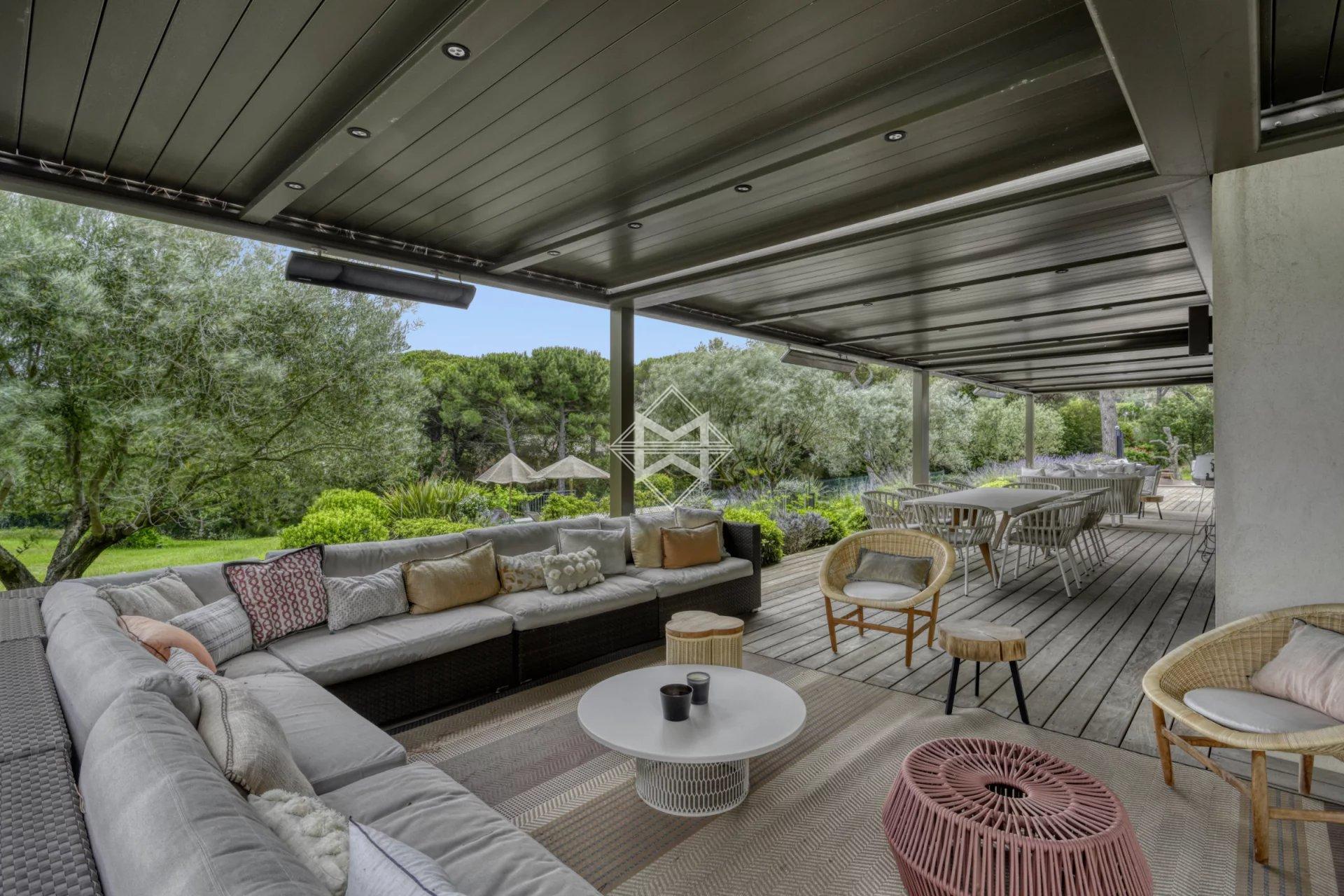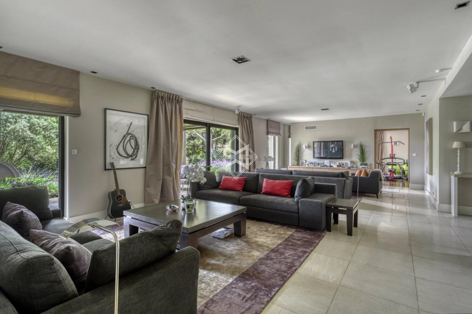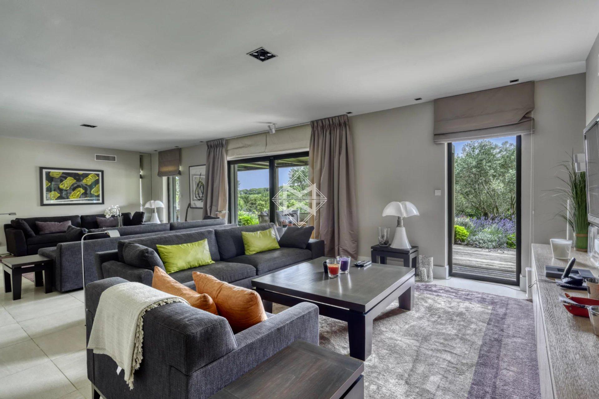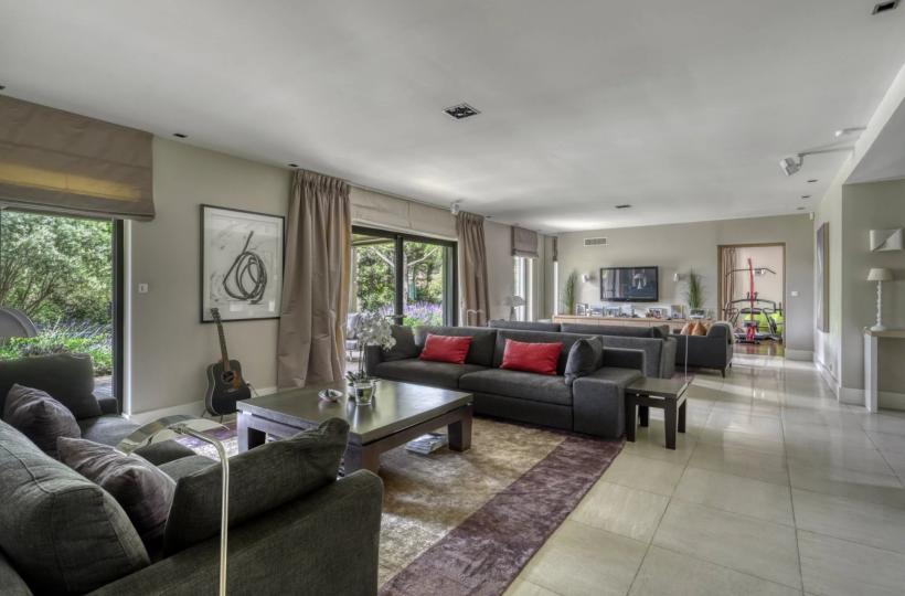 The villa enjoys a spacious and light-filled living room thanks to large windows opening onto beautiful terraces and the pool area.