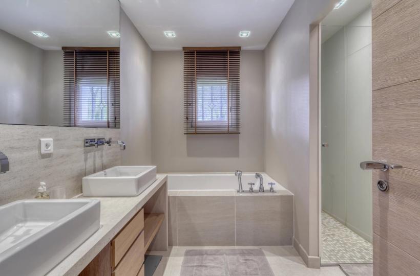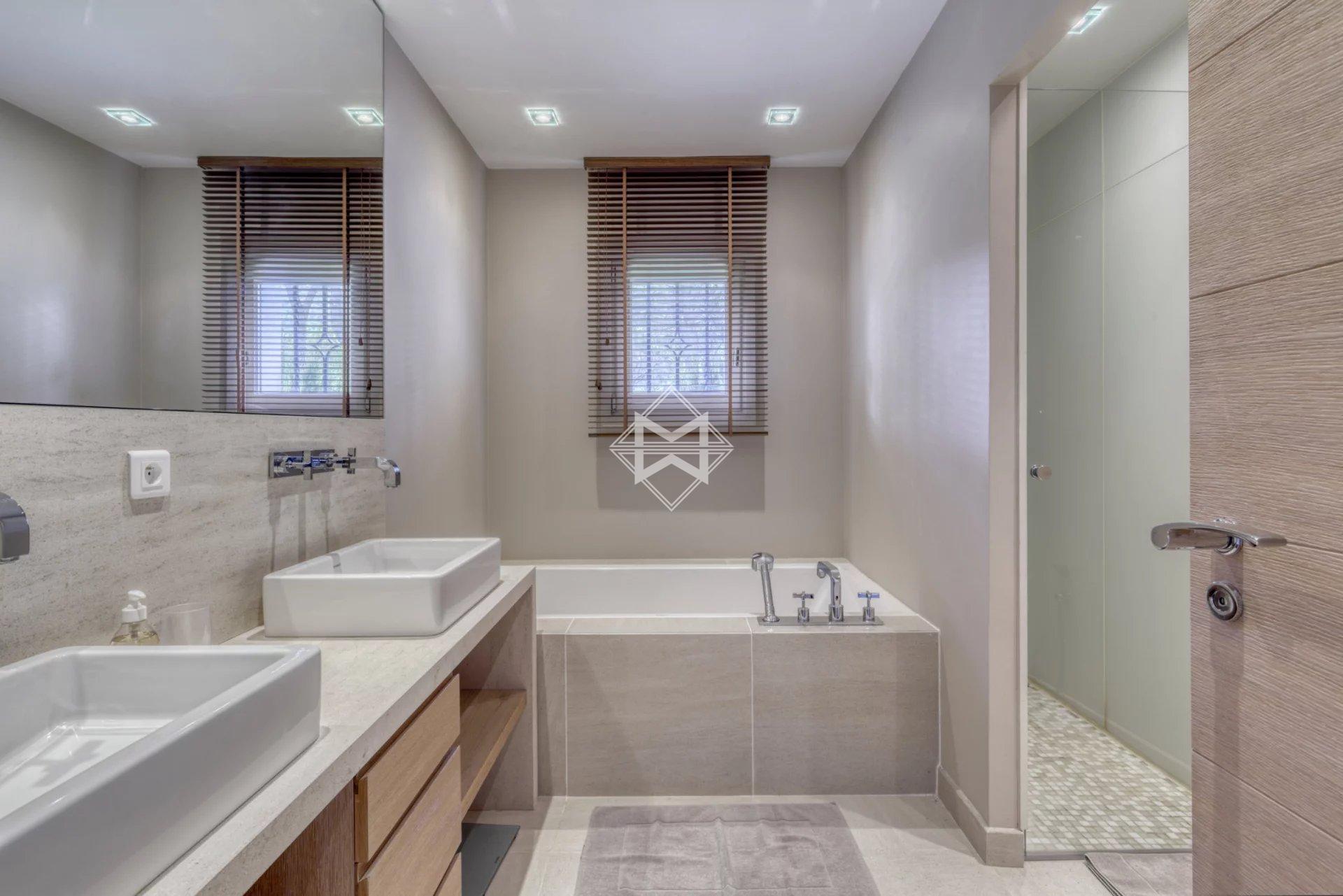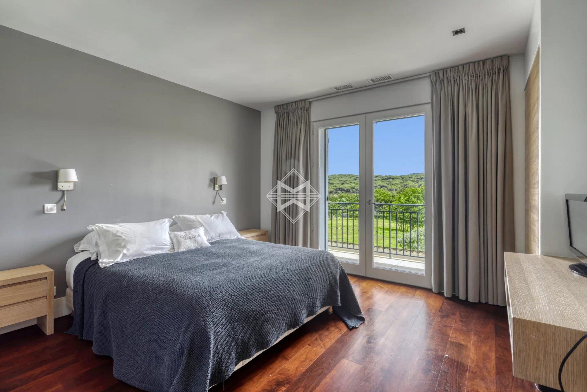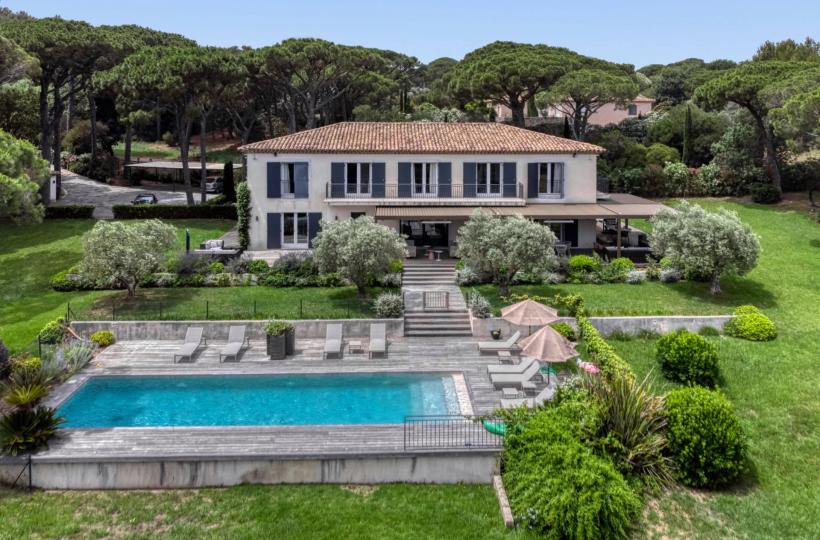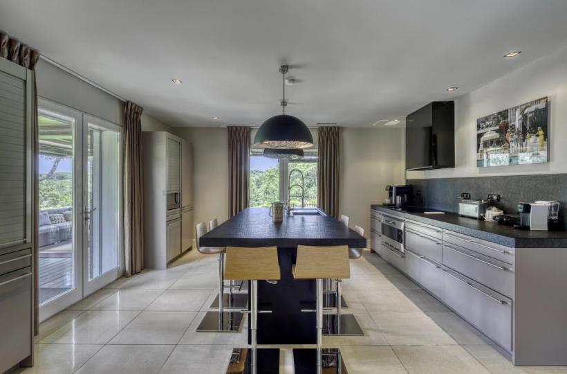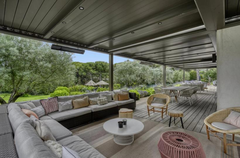 The villa enjoys a spacious and light-filled living room thanks to large windows opening onto beautiful terraces and the pool area.