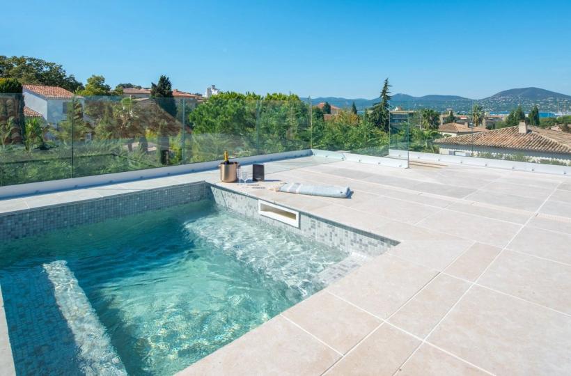 The charm asset: the master bedroom offers direct access to a rooftop with jacuzzi, panoramic view of the village of Saint Tropez, the port and the sea.