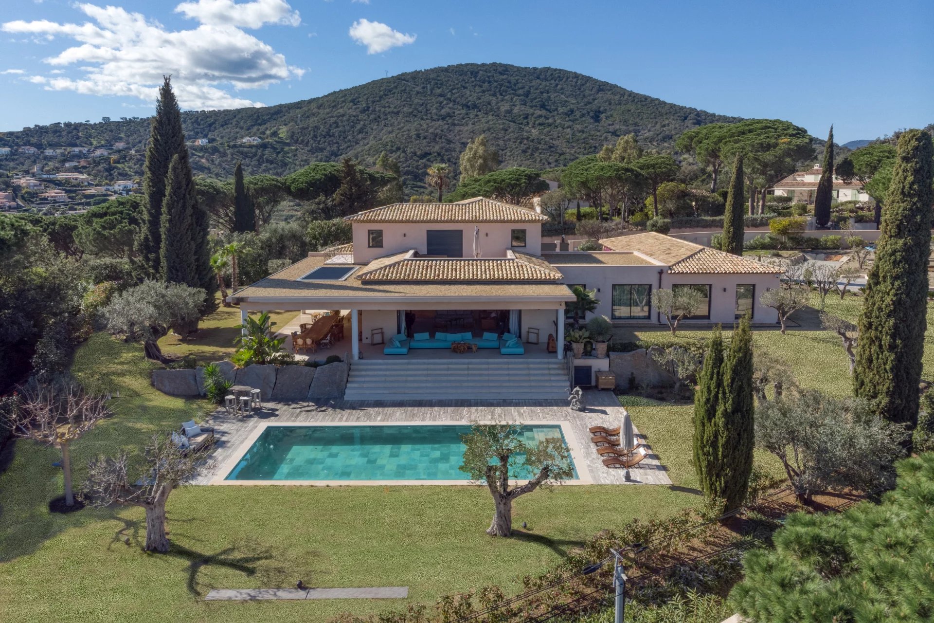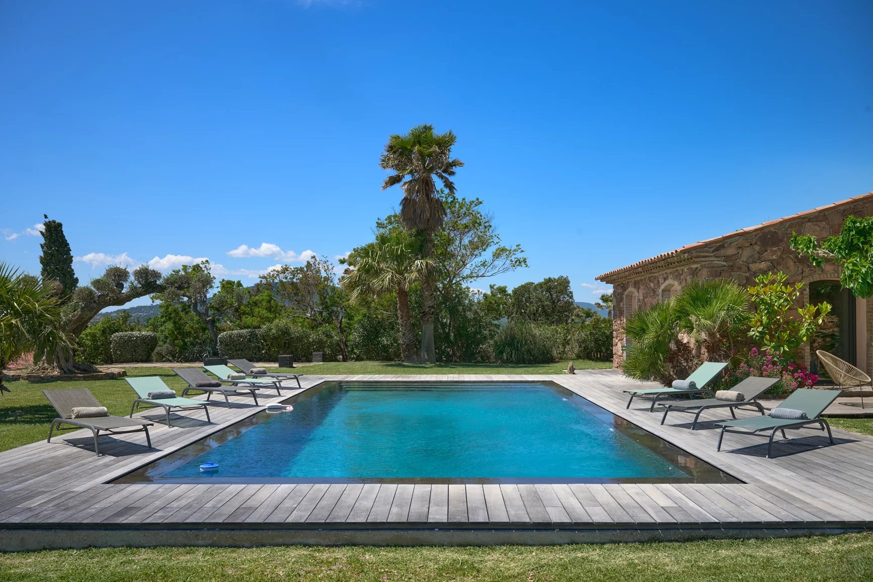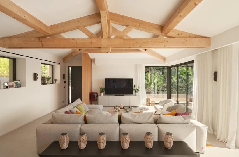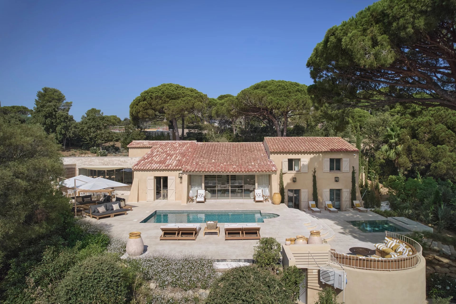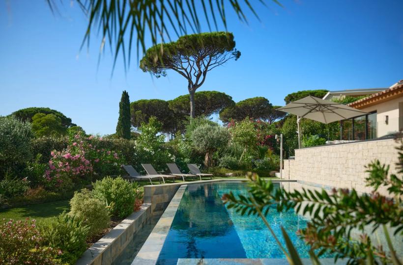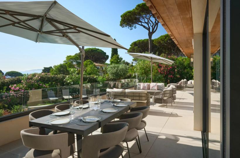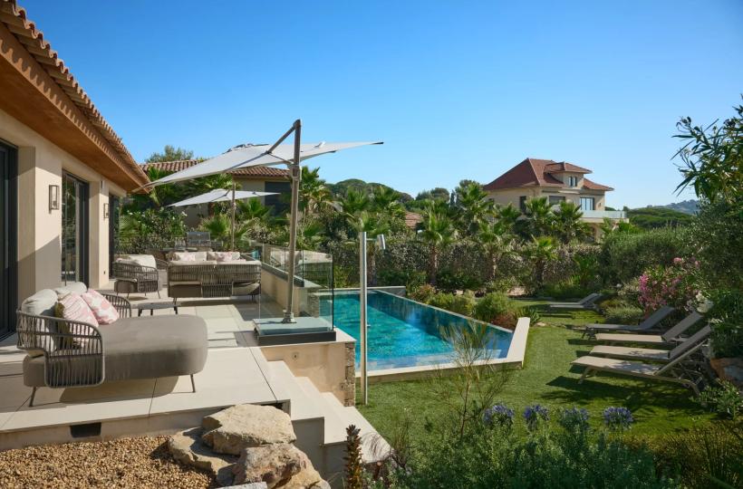 Designed with wellness and conviviality in mind, the villa includes a private fitness room, a generous cross-through main terrace with al fresco lounging and dining areas, a built-in barbecue, and luxurious outdoor sofas. On the upper level, a rooftop terrace provides the ideal setting for sunset cocktails in total serenity. A magnificent 5 x 10 metre swimming pool, surrounded by elegant sun loungers, is bathed in sunlight from dawn until dusk.