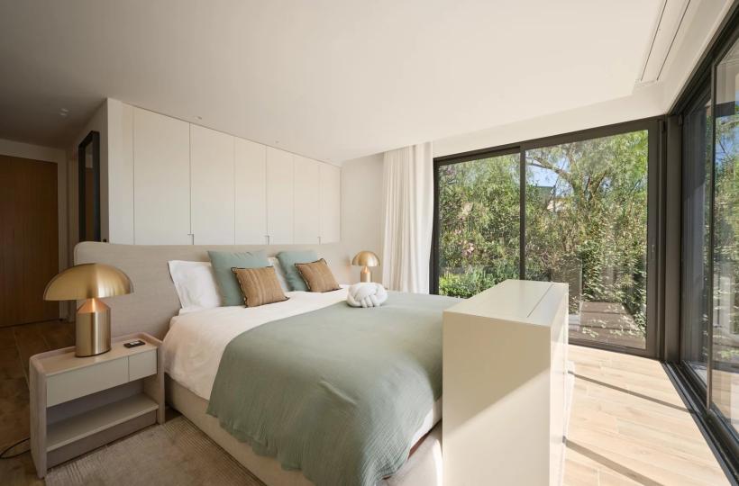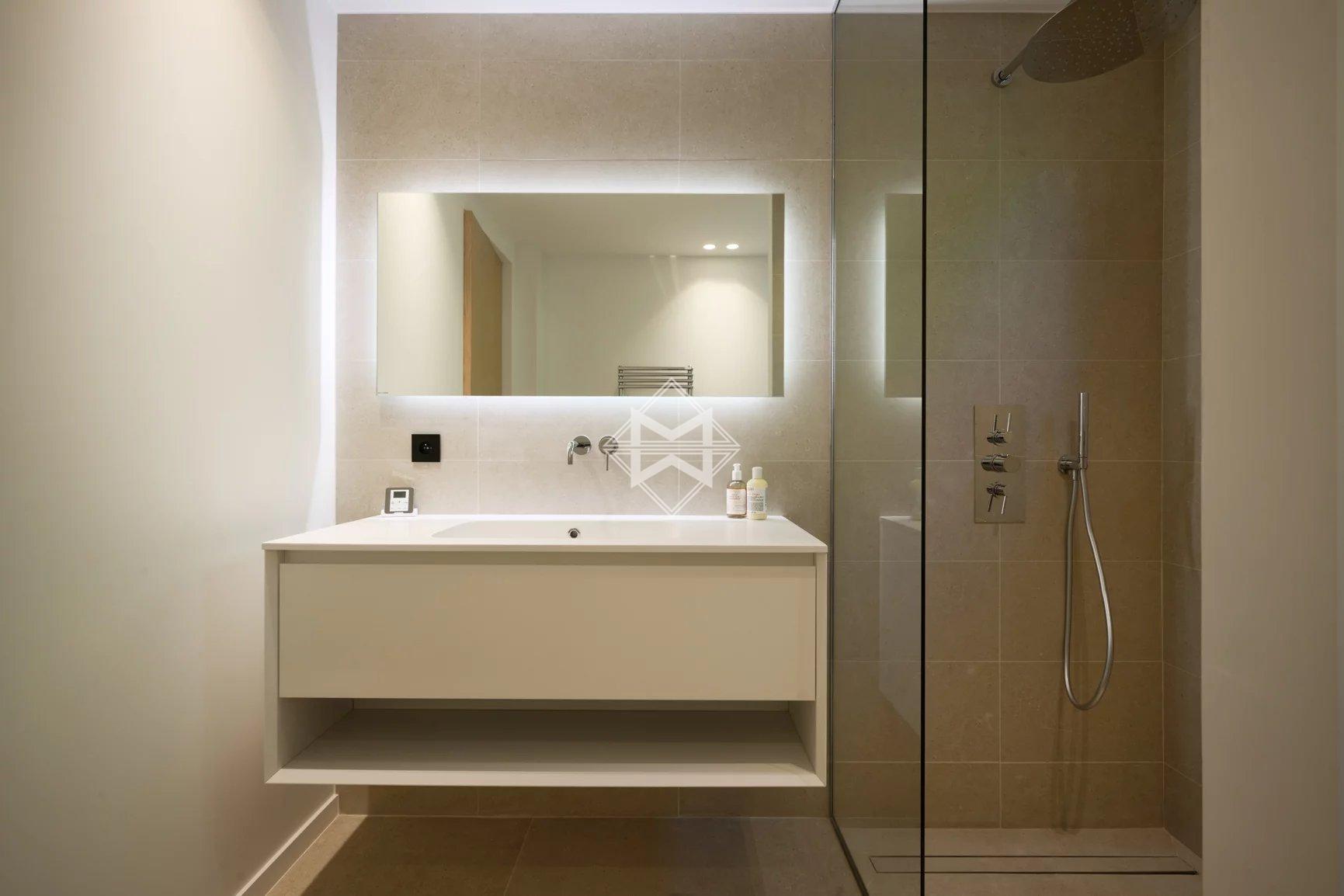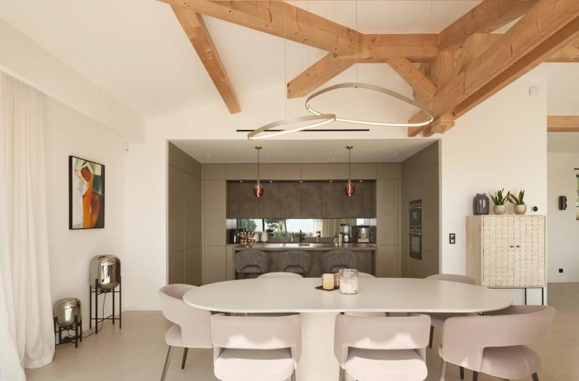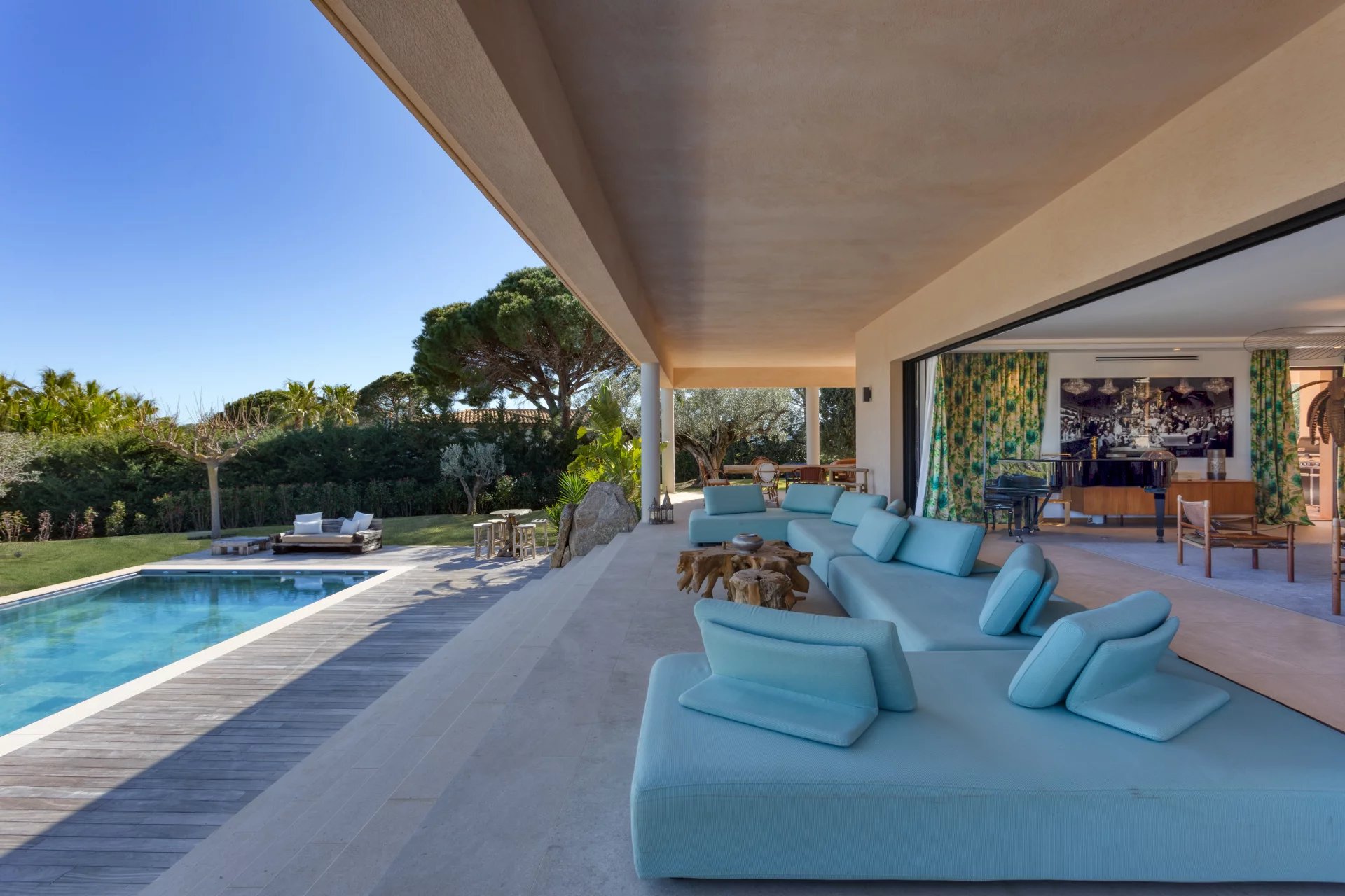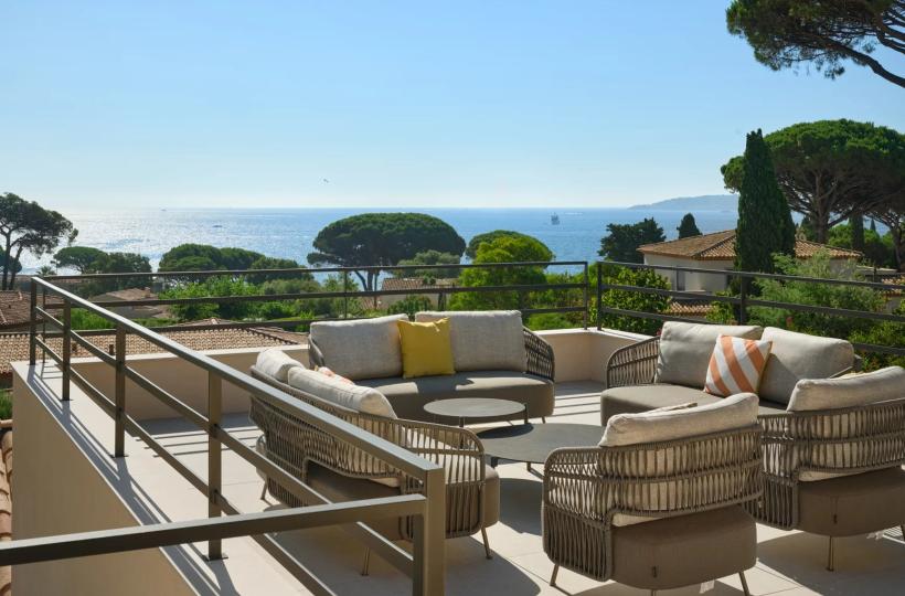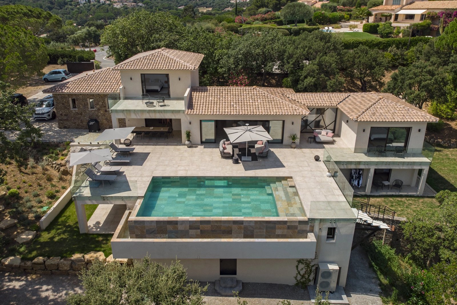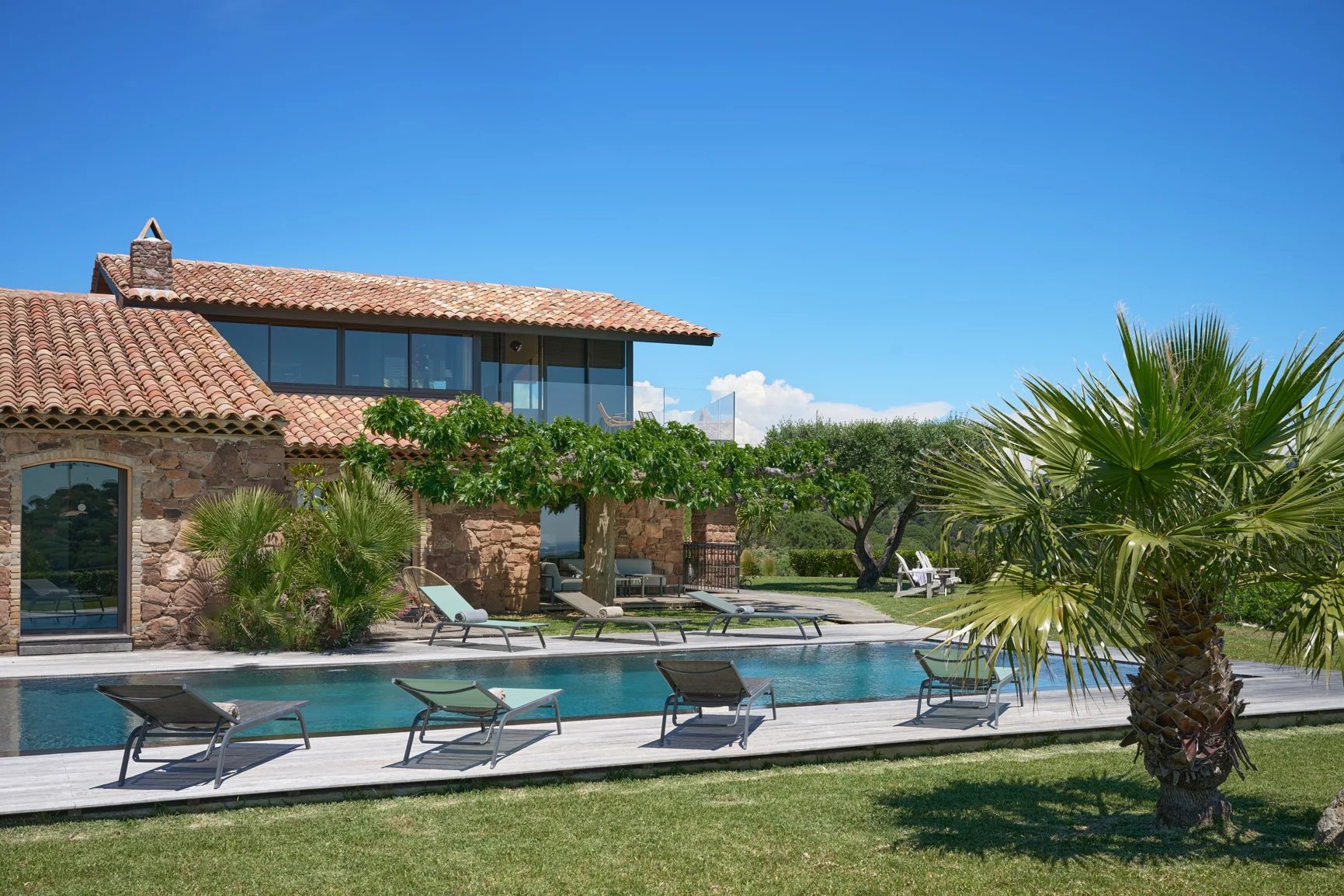 Designed with wellness and conviviality in mind, the villa includes a private fitness room, a generous cross-through main terrace with al fresco lounging and dining areas, a built-in barbecue, and luxurious outdoor sofas. On the upper level, a rooftop terrace provides the ideal setting for sunset cocktails in total serenity. A magnificent 5 x 10 metre swimming pool, surrounded by elegant sun loungers, is bathed in sunlight from dawn until dusk.
