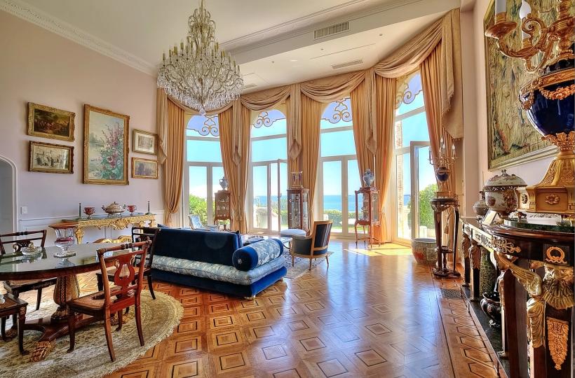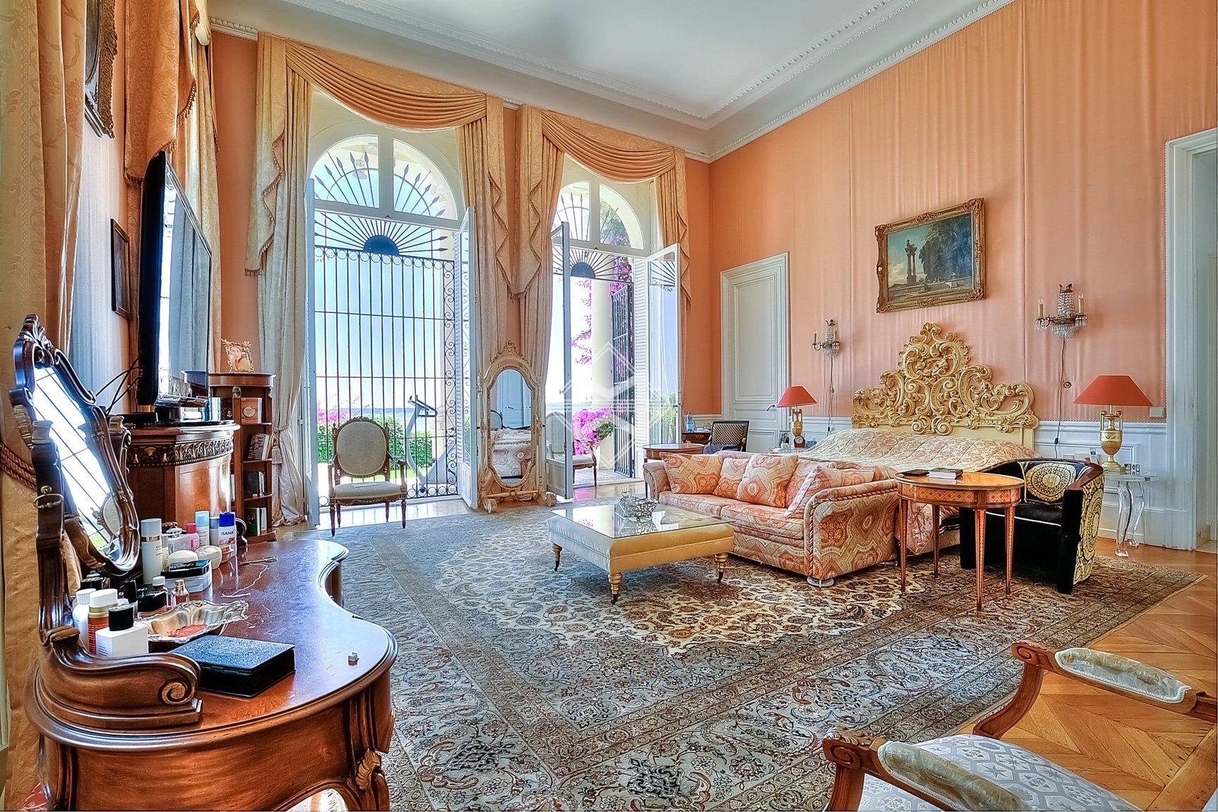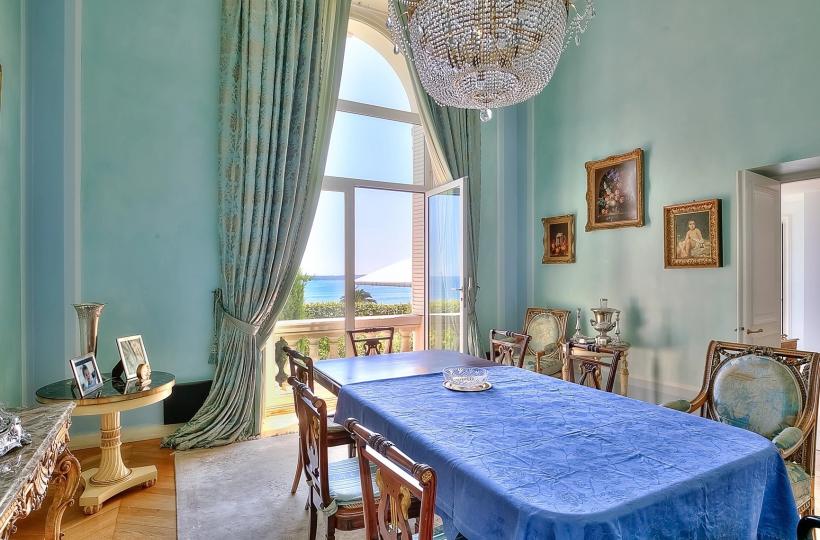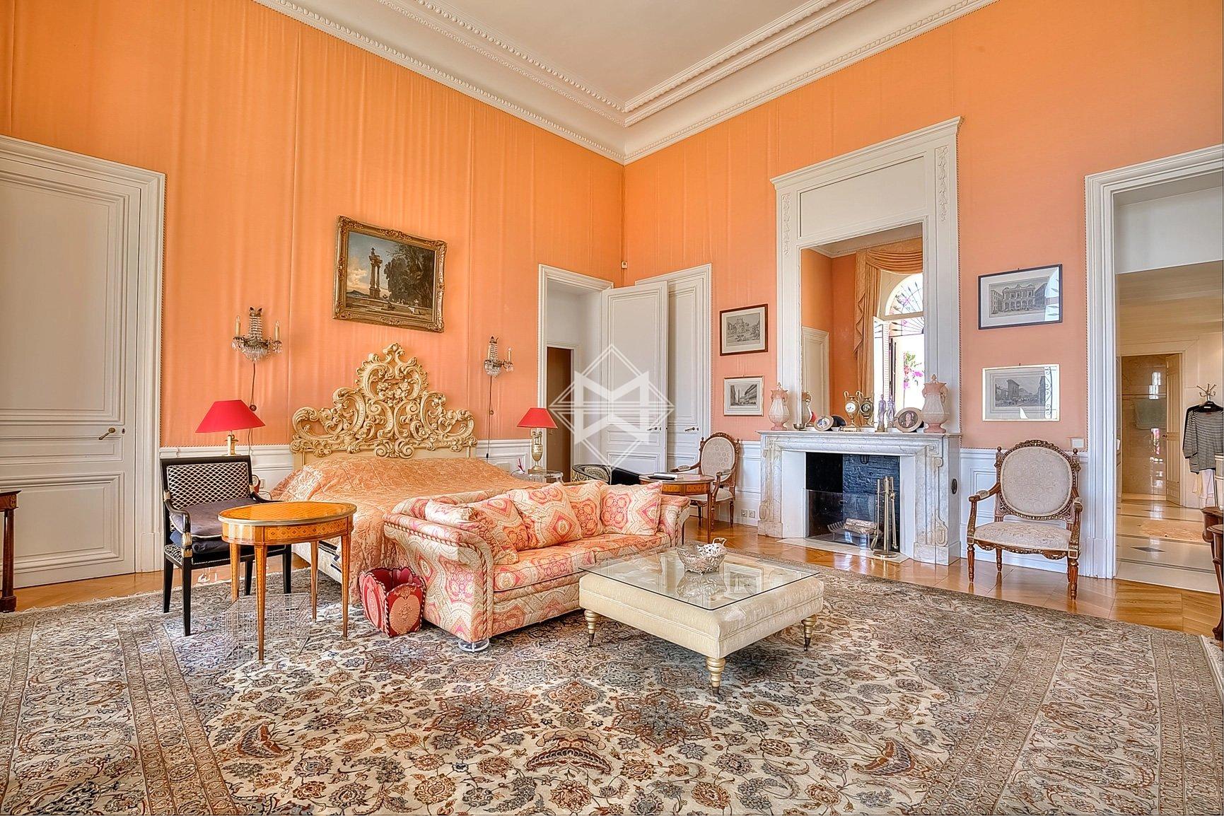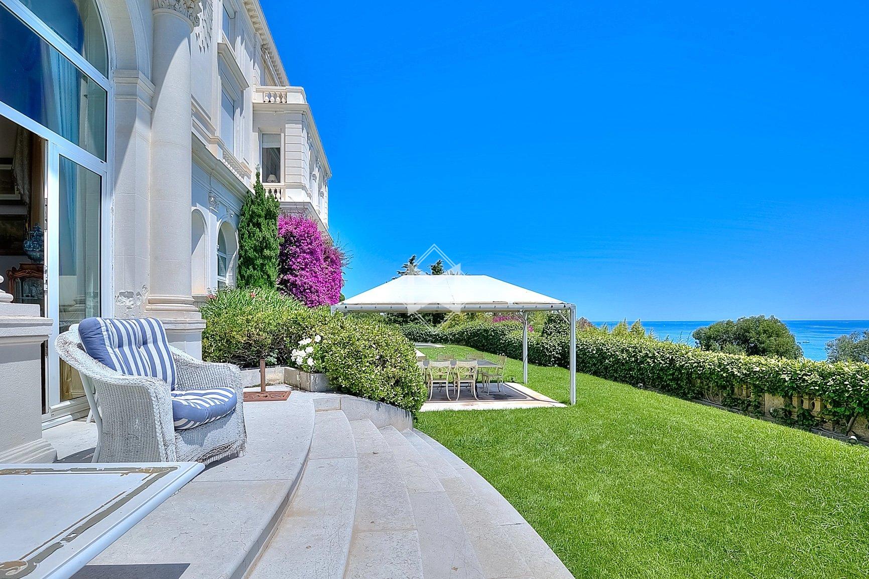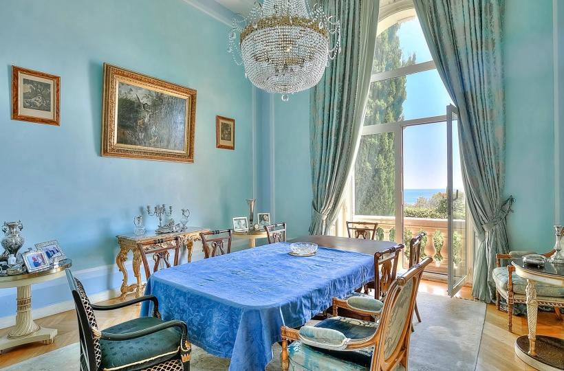 This villa-apartment, with sea views, is located within a prestigious Belle Époque residence, secured with a caretaker. This historic building, influenced by Italian architecture, is nestled in a lush residential park within a gated domain. The estate is planted with rare Mediterranean species and includes a charming pond.