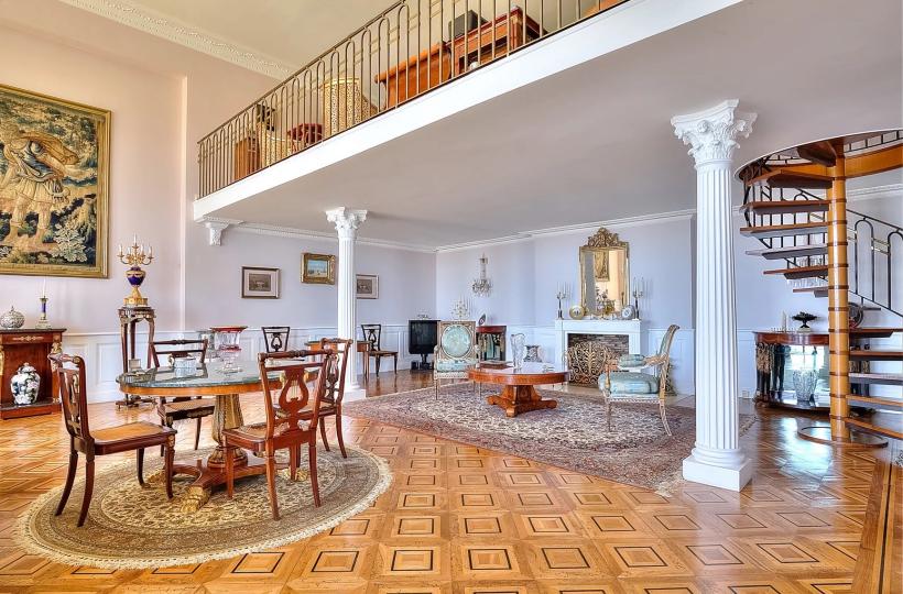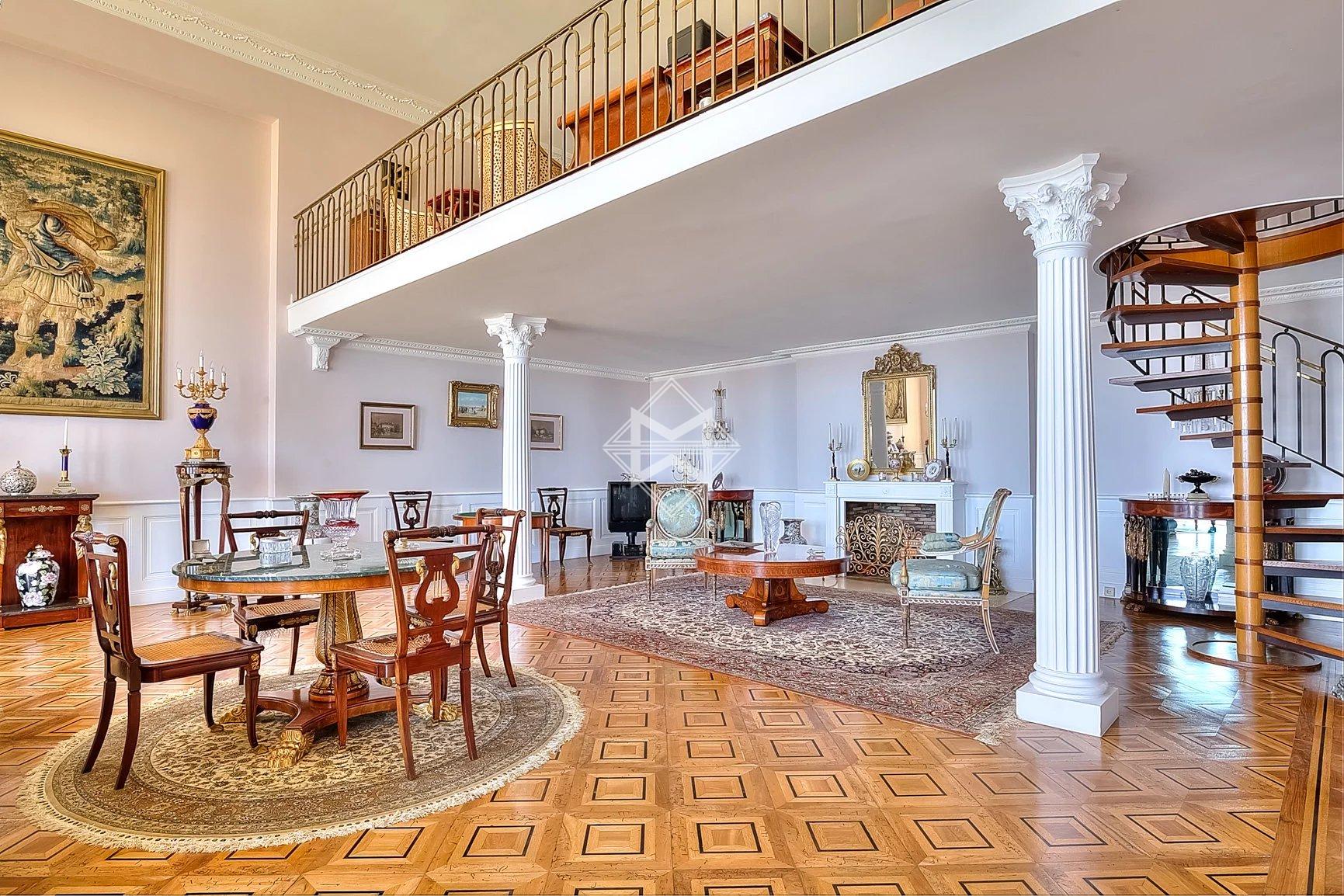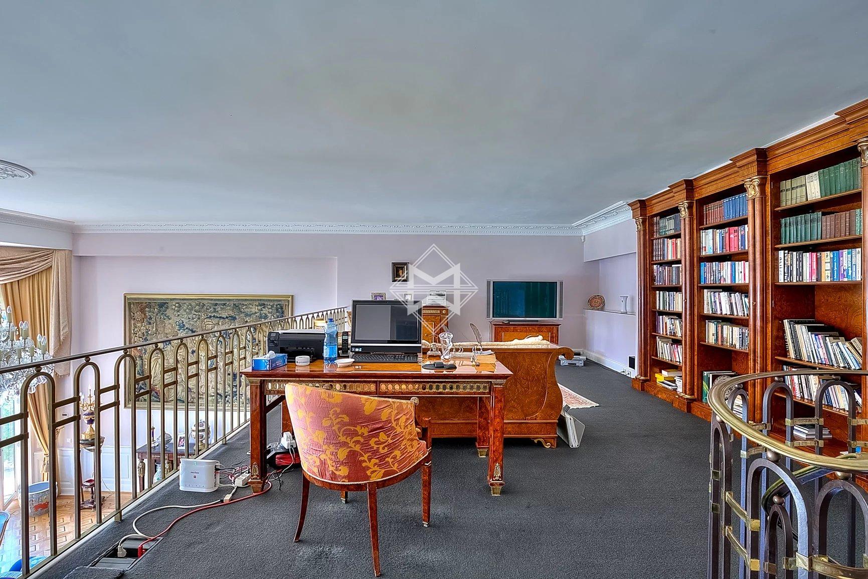 The apartment consists of a majestic master bedroom with an en-suite bathroom and dressing room, a mezzanine guest room with its own bathroom, as well as two additional guest bedrooms with bathrooms on the upper floor. A large entrance hall and guest toilets complete this exceptional property. Additionally, there is a caretaker’s accommodation on the lower level, a large cellar, and 4 private parking spaces.