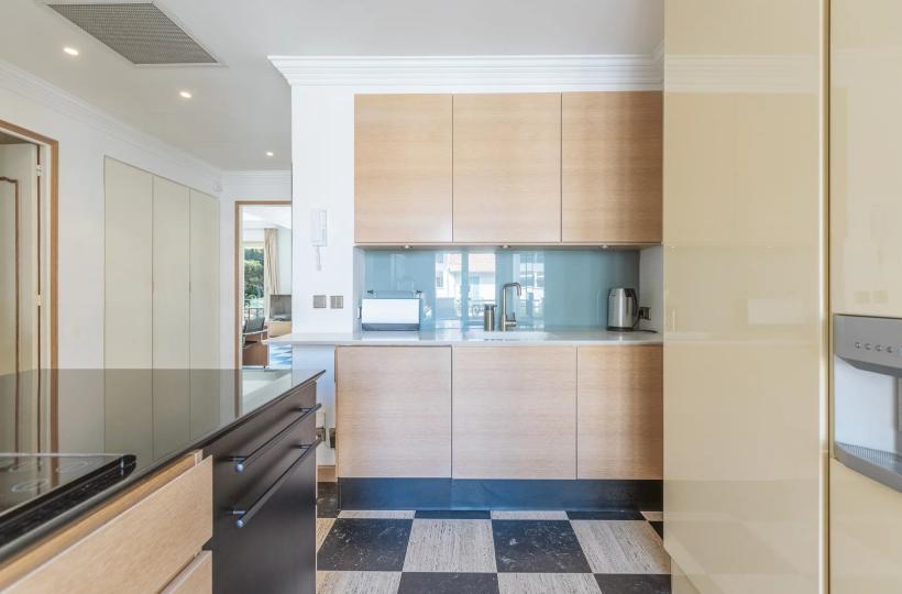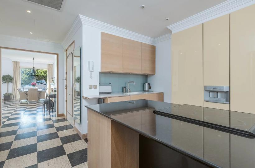 Elegant, classic kitchen equipped with modern amenities and access to a lovely morning terrace, ideal for enjoying your breakfast in the sunshine.