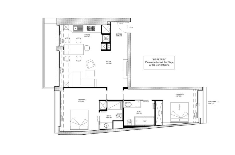 It consists of an entrance hall, a living room and open kitchen, two bedrooms and two bathrooms.