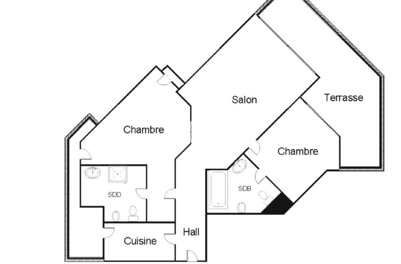 An entrance, separate kitchen, living room opening onto a large terrace, 1 bedroom with bathroom, 1 bedroom with shower room.