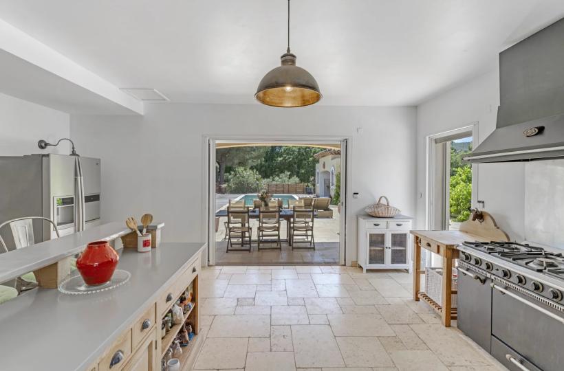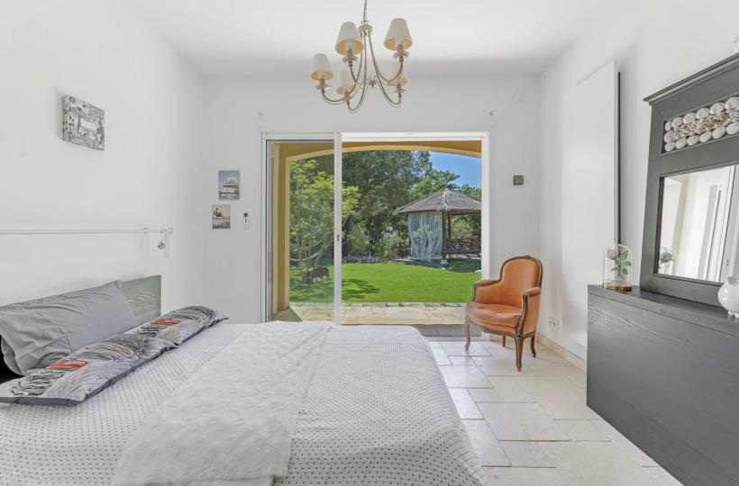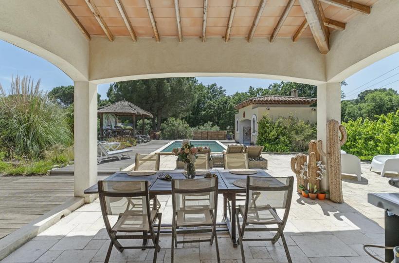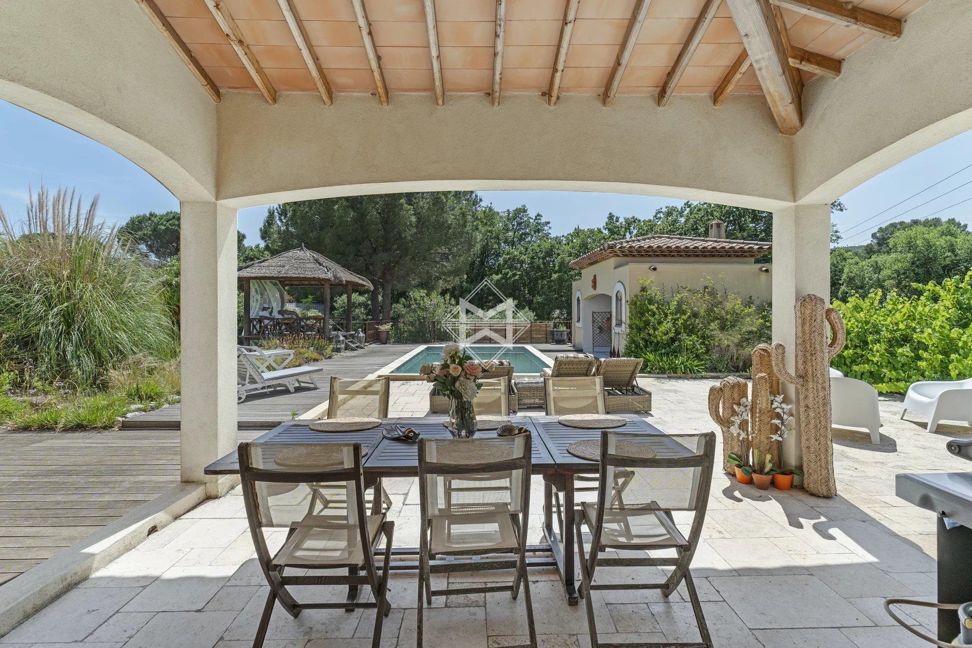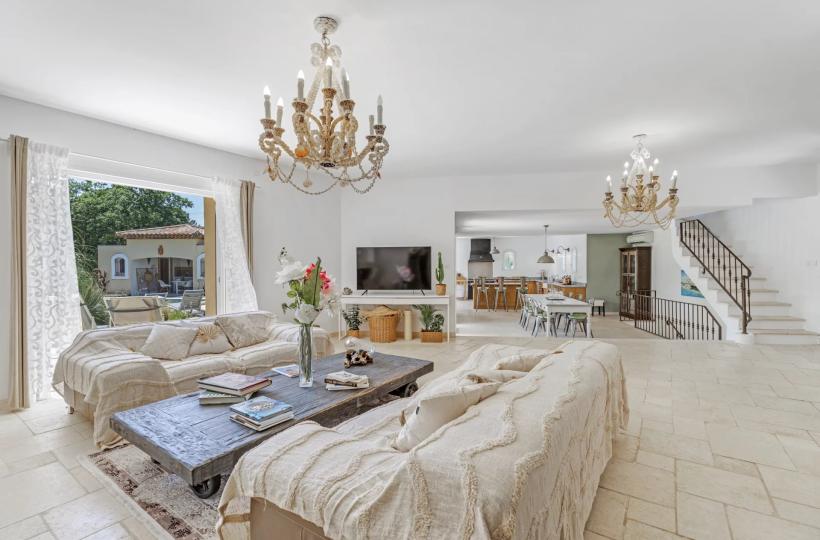 The ground floor features a large living room opening onto the garden and pool, a bright dining room with a covered terrace, and a fully equipped kitchen.