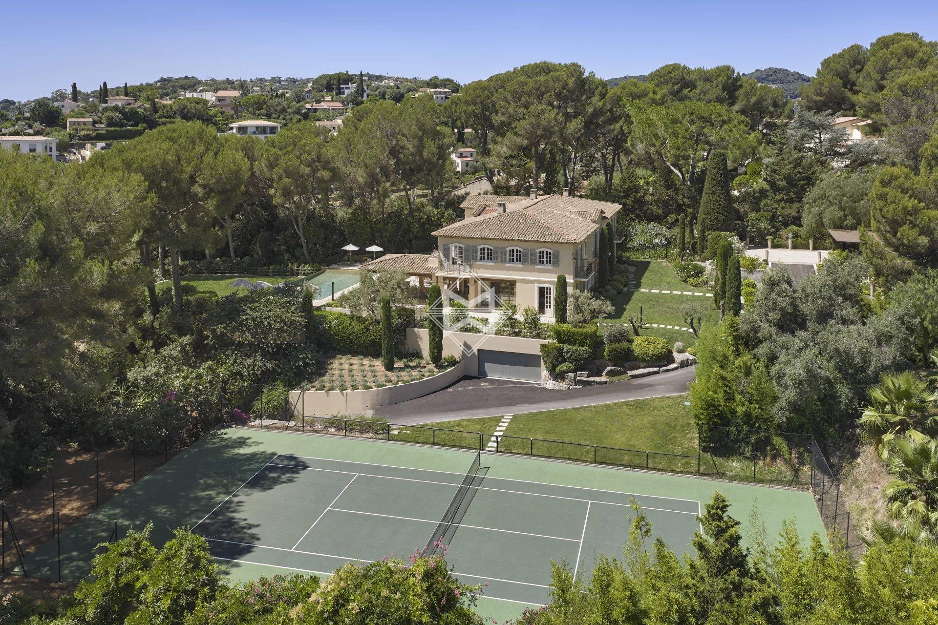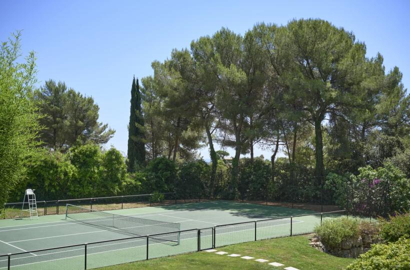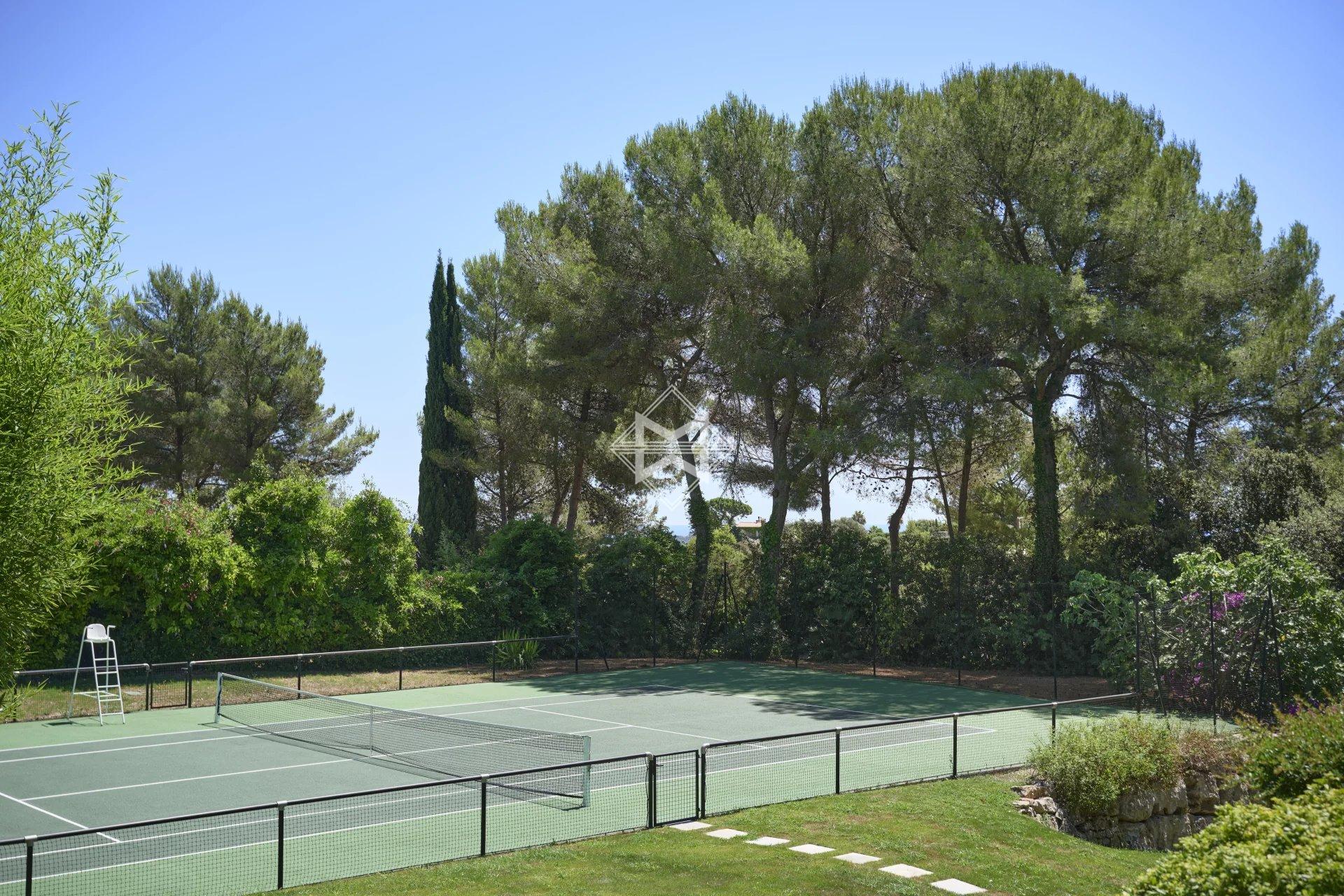 At the entrance, a 70 m² caretaker's cottage welcomes visitors, while a tennis court and spacious garages for 4 to 5 vehicles line the private driveway.