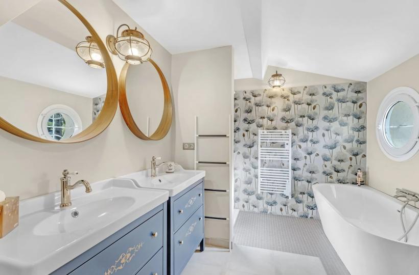 On the ground floor, the bright and generous living room opens onto a fully equipped modern kitchen, both extending onto a shaded terrace and sparkling pool. Of the two en-suite bedrooms on this level, one opens directly onto the garden, offering sea views that captivate from sunrise to sunset.