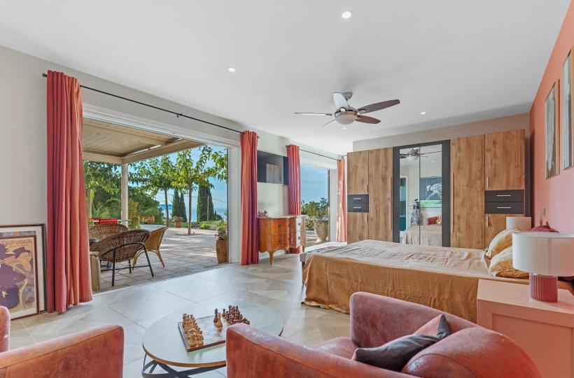 The garden, designed as a living Mediterranean landscape, unfolds in harmonious terraces and secret corners, featuring palms and oleanders. A bioclimatic pergola, cellars, a pantry, and a workshop complete this exceptional setting, creating a lifestyle where serenity, privacy, and natural beauty coexist perfectly.