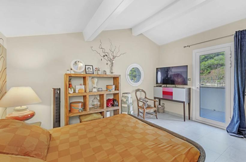 Upstairs, a cozy, intimate space invites relaxation or reading. The master suite and two additional bedrooms to refresh, sharing a bathroom, open onto the rooftop terrace, a true belvedere over the azure horizon where sky and sea seem to merge.