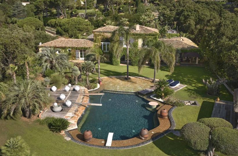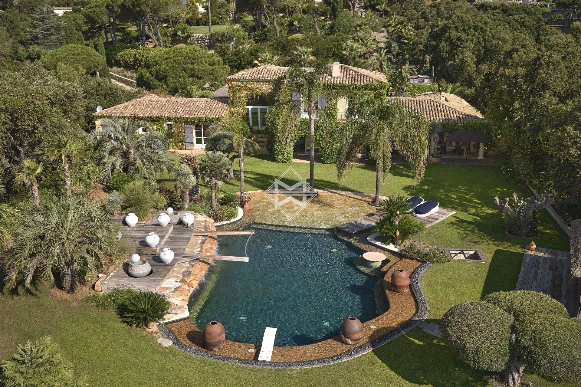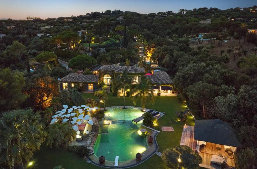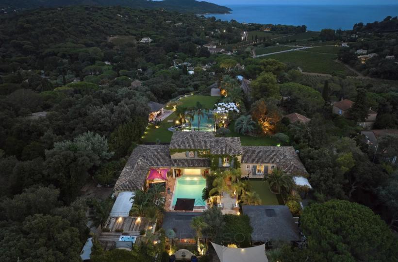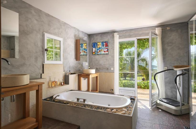 This haven of peace with a sea view on Cap Lardier sits on flat land of 7,114 m2 with Mediterranean species. A large patio is fitted out by a heated swimming pool with counter-current, a gym and a relaxation lounge with Polynesian roofs.