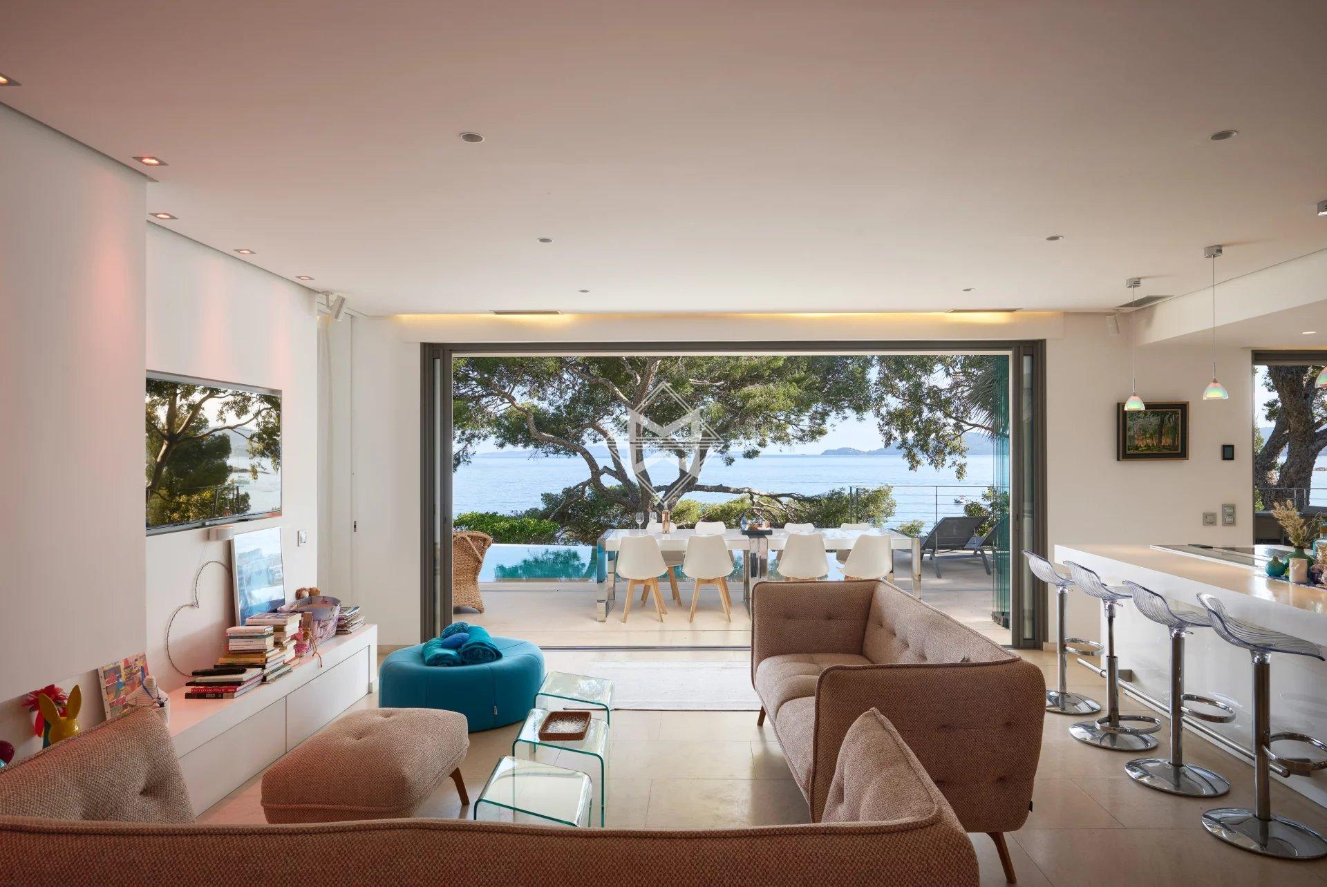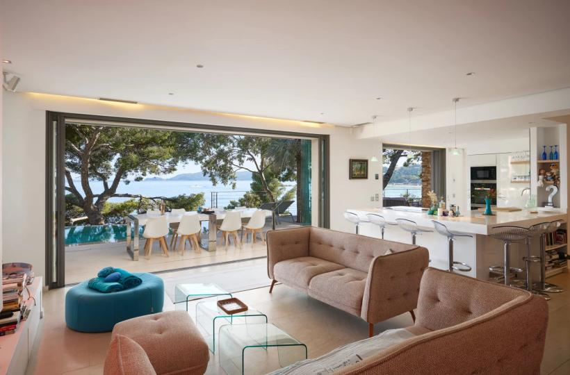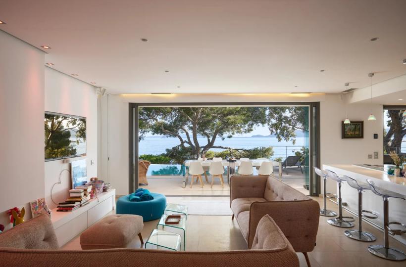 The bright living room, kitchen, and dining area open to the endless sea, offering a mesmerizing view of waves caressing the parasol pines.