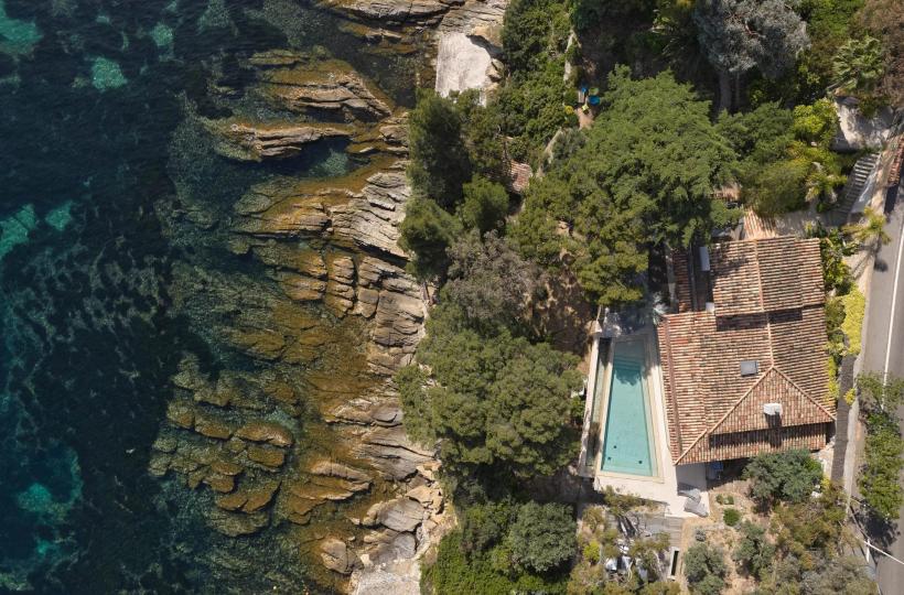 A rare feature for a waterfront property, an authorized swimming pool set among the rocks enhances its appeal. The sunny, lush terrace provides a serene and private atmosphere.