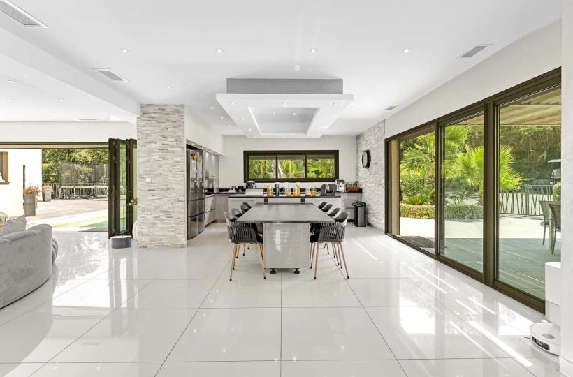 The central living area spans nearly 130 sqm, bathed in natural light and unfolding into several open-plan zones: a high-end south-facing kitchen, an elegant dining area, a main lounge overlooking the pool, and a more intimate TV lounge. Each space opens generously to the outdoors, creating a seamless connection with nature through expansive floor-to-ceiling windows.
