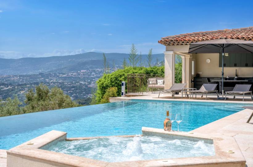 Facing south, this elegant villa is set on a plot of over 5,000m², including a magnificent olive grove with sixty century-old trees, offering a delightful space with a heated infinity pool, jacuzzi, and a pool house with a summer kitchen — an ideal setting for summer lunches.