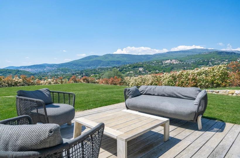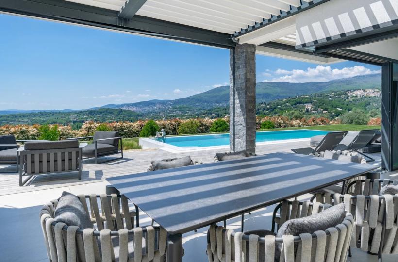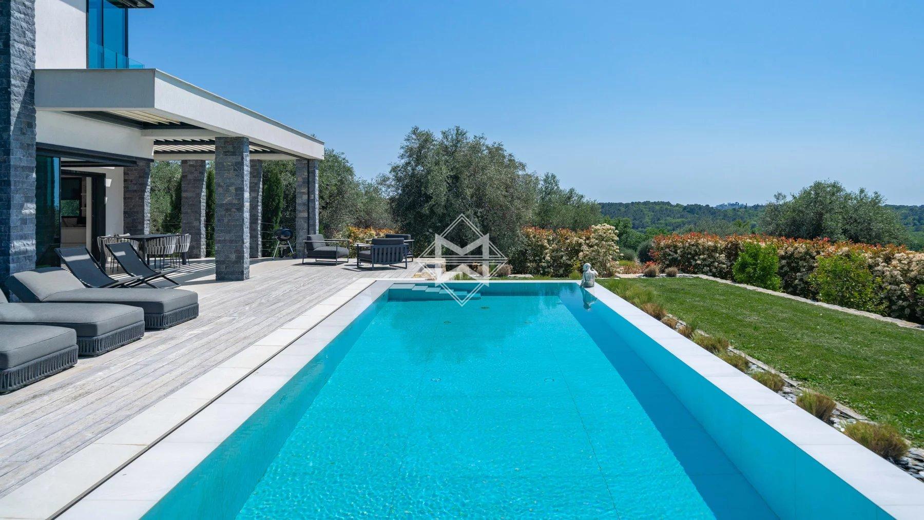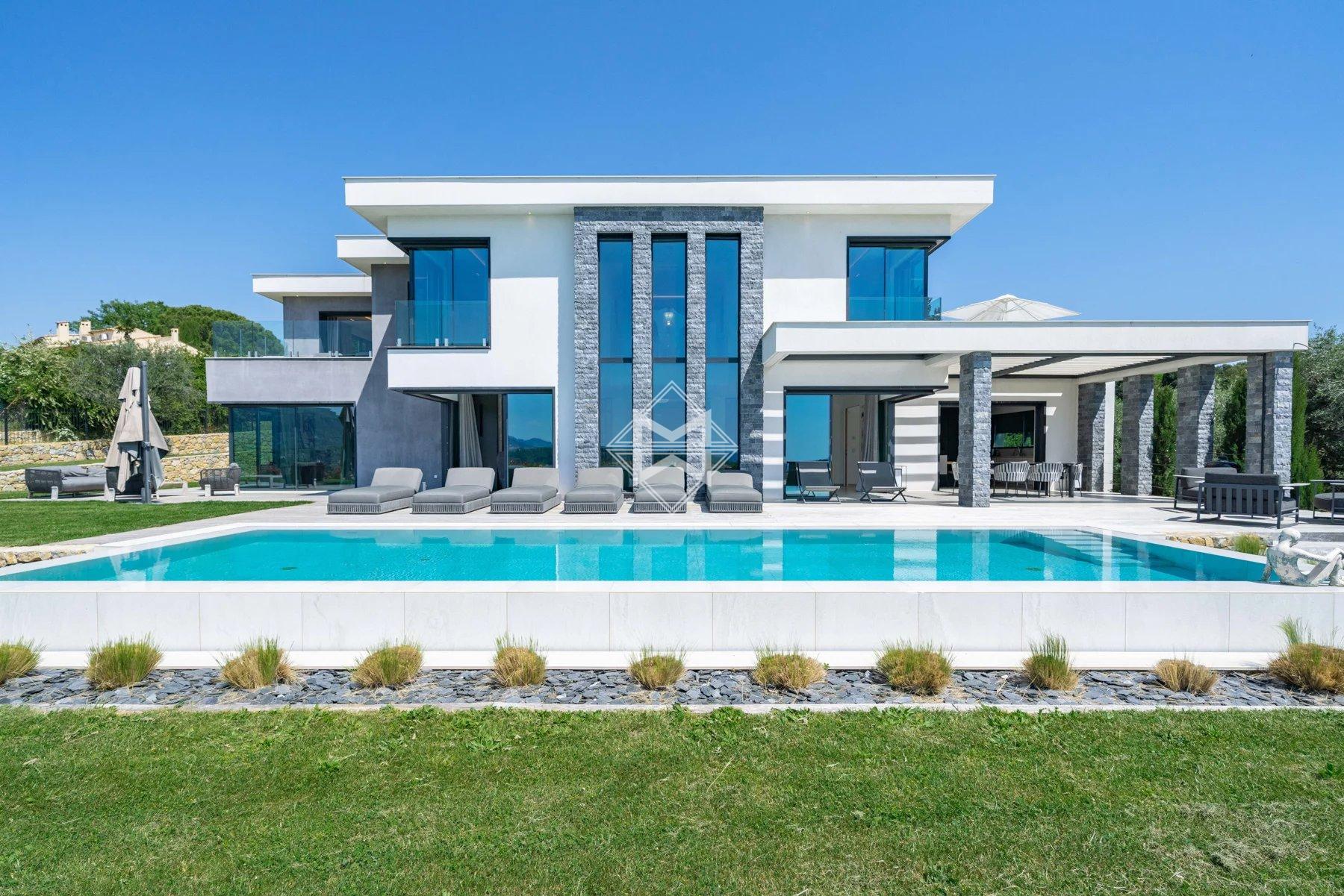 Close to Valbonne, in a commanding position and boasting magnificent panoramic views of the golf course, surrounding villages, and hills, this splendid, recently built villa boasts contemporary architecture and offers approximately 438m² of living space.
