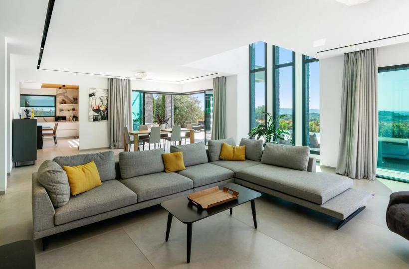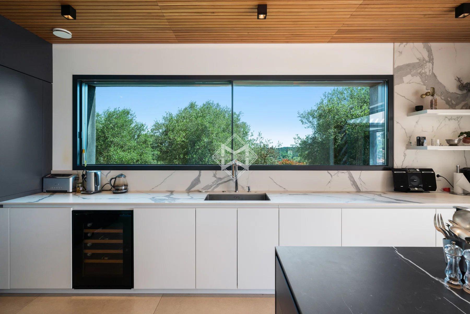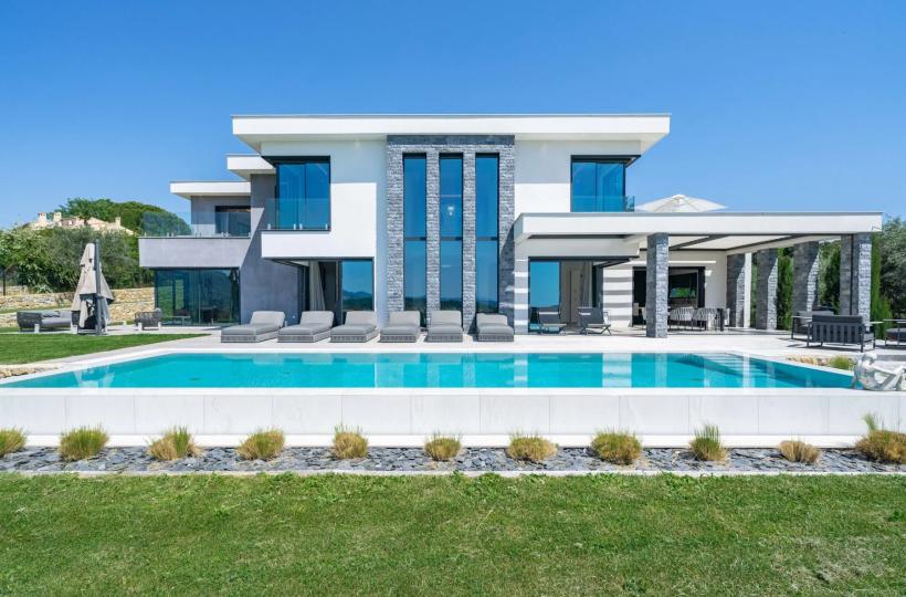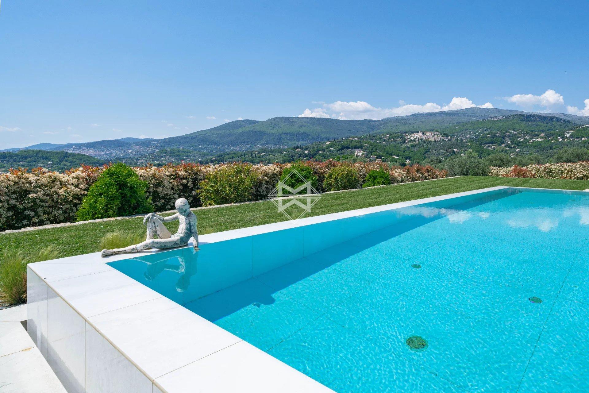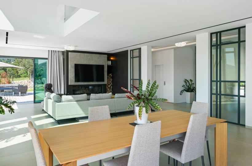 Close to Valbonne, in a commanding position and boasting magnificent panoramic views of the golf course, surrounding villages, and hills, this splendid, recently built villa boasts contemporary architecture and offers approximately 438m² of living space.
