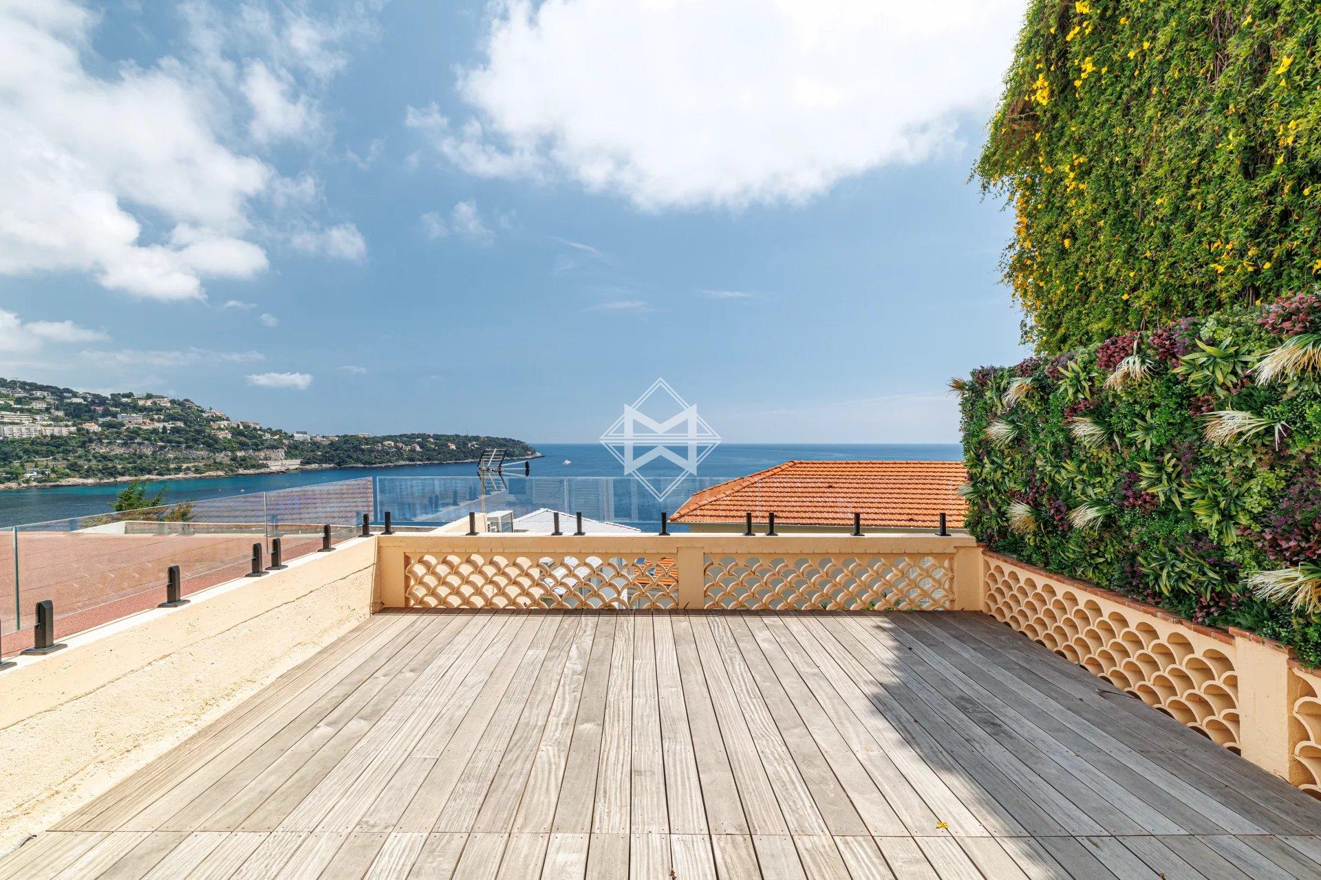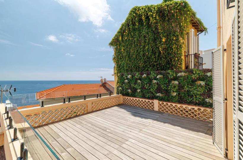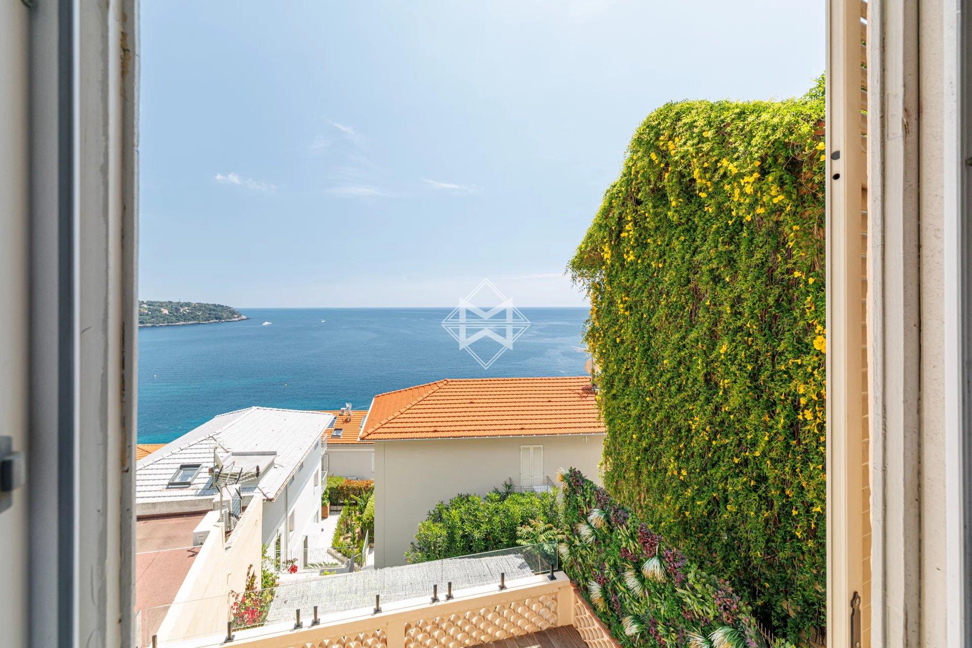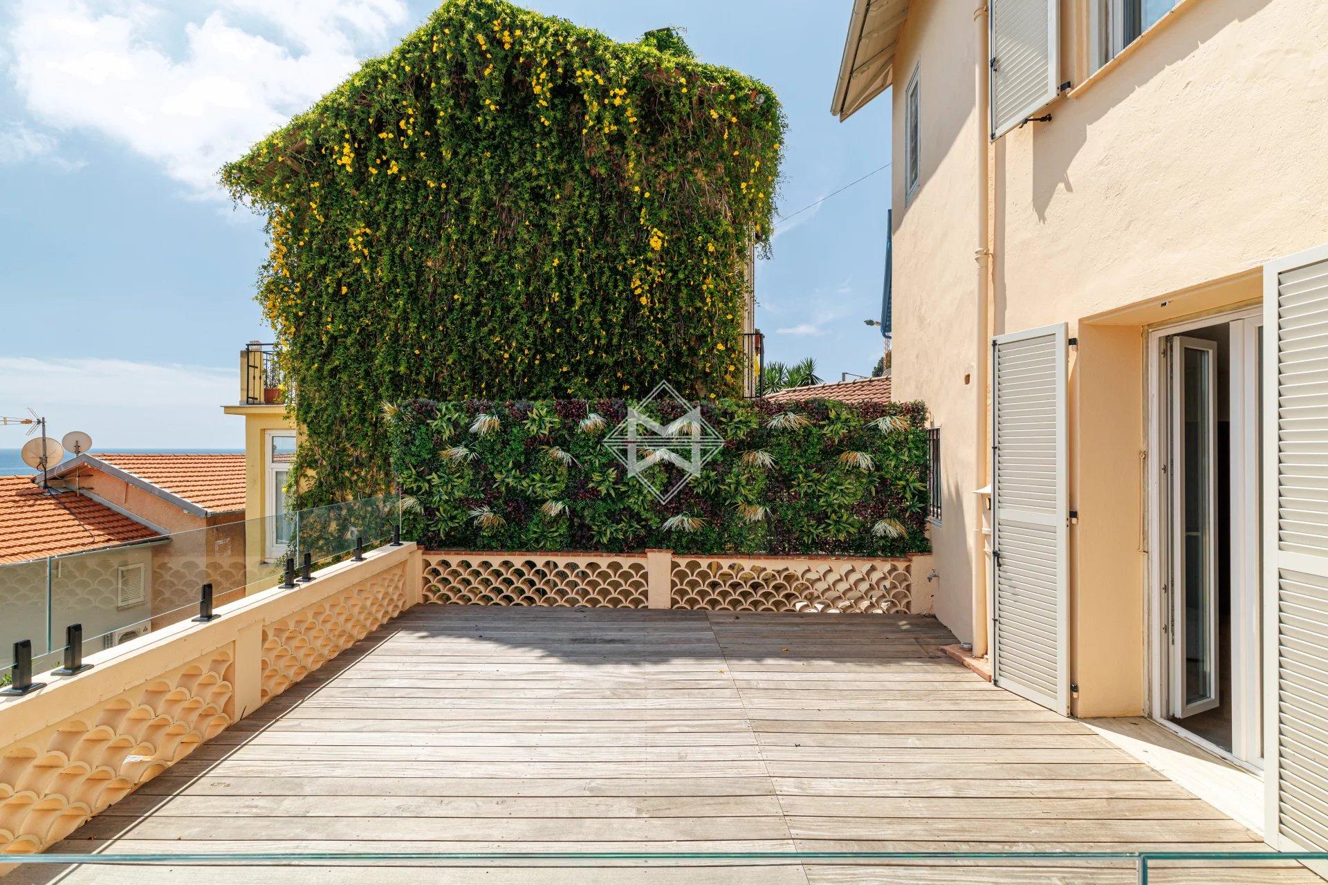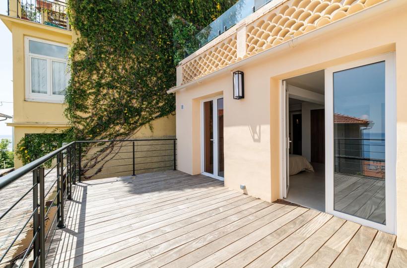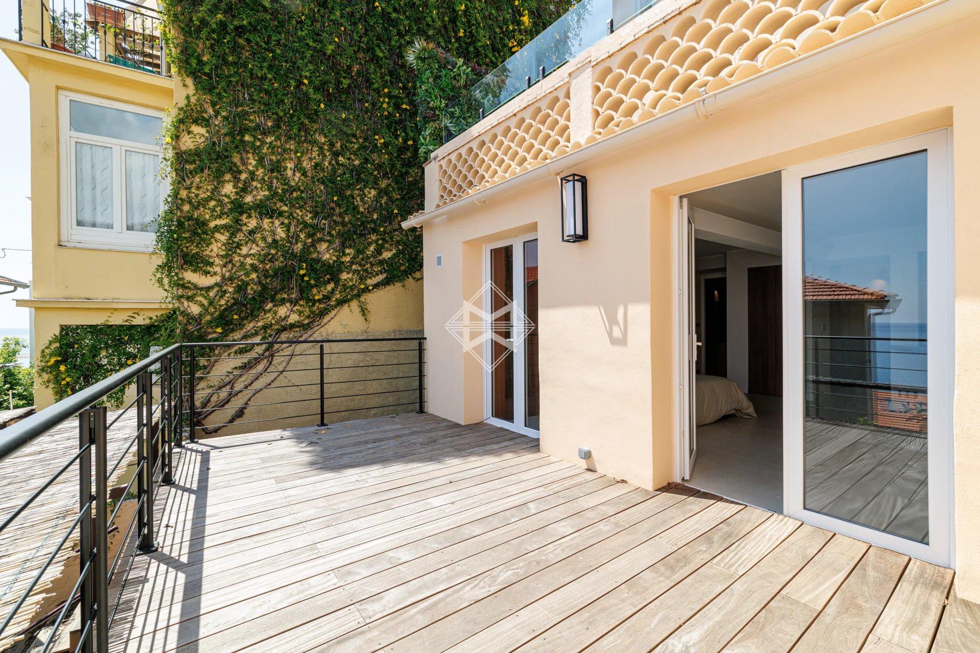 Nestled in an exceptional setting, this fully renovated house seamlessly combines authenticity with contemporary comfort. It is divided into two independent apartments, each offering stunning sea views. The main apartment, a bright two-bedroom duplex, features a spacious living room with a semi-open kitchen that opens onto a sunny terrace facing Cap Martin. Upstairs, two comfortable en-suite bedrooms also offer beautiful sea views. A laundry room, a small cellar, and high-end features complete this property. A separate, perfectly arranged studio provides an ideal space for hosting guests or rental opportunities. It also benefits from a private terrace with breathtaking sea views. A third, convivial terrace allows for the installation of a jacuzzi or a barbecue area, perfect for enjoying the outdoor setting. A secure, enclosed garage for rent is available just 10 meters away, with the option to rent a second parking space. Agency fees payable by vendor