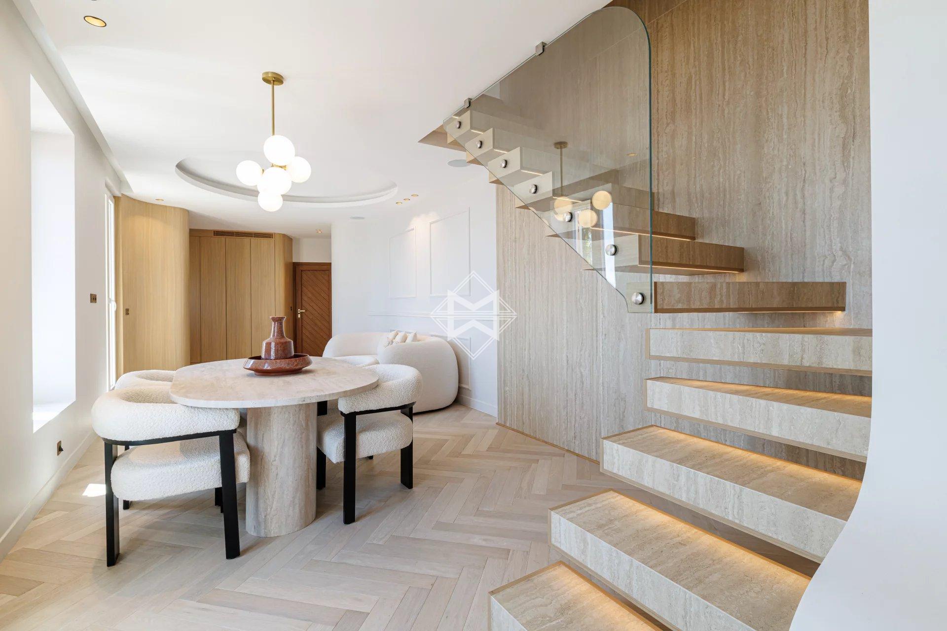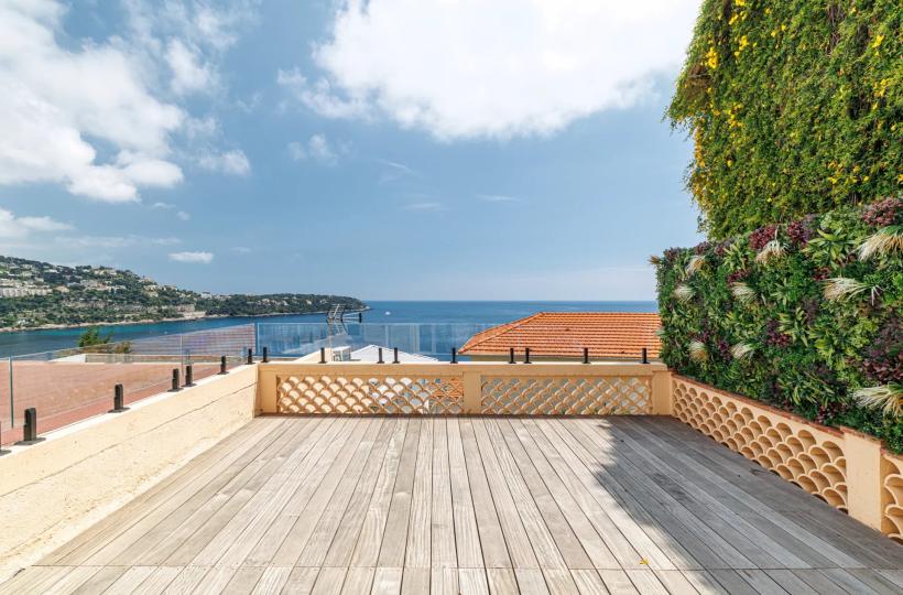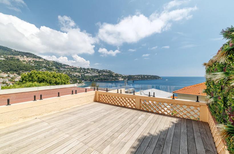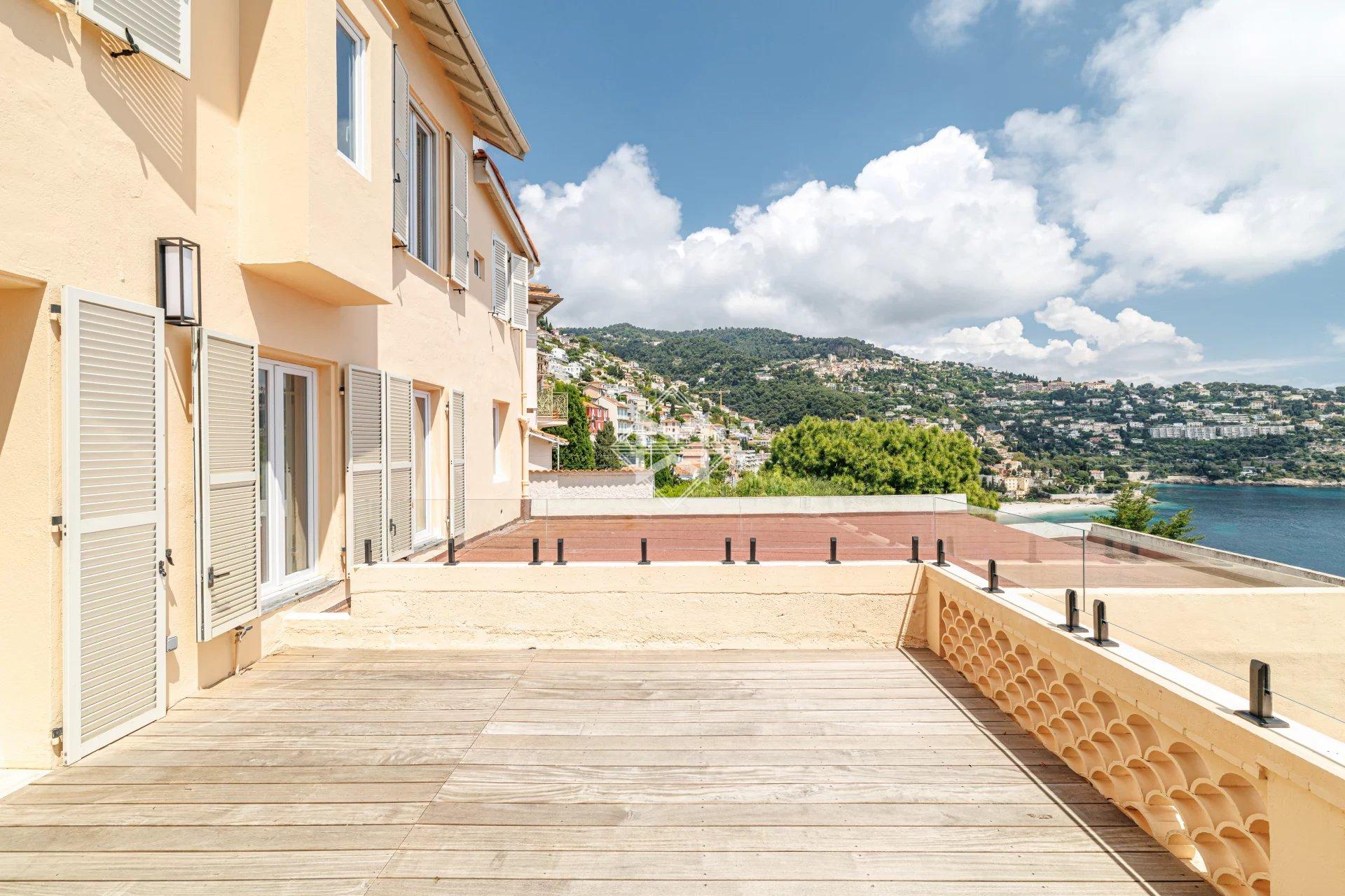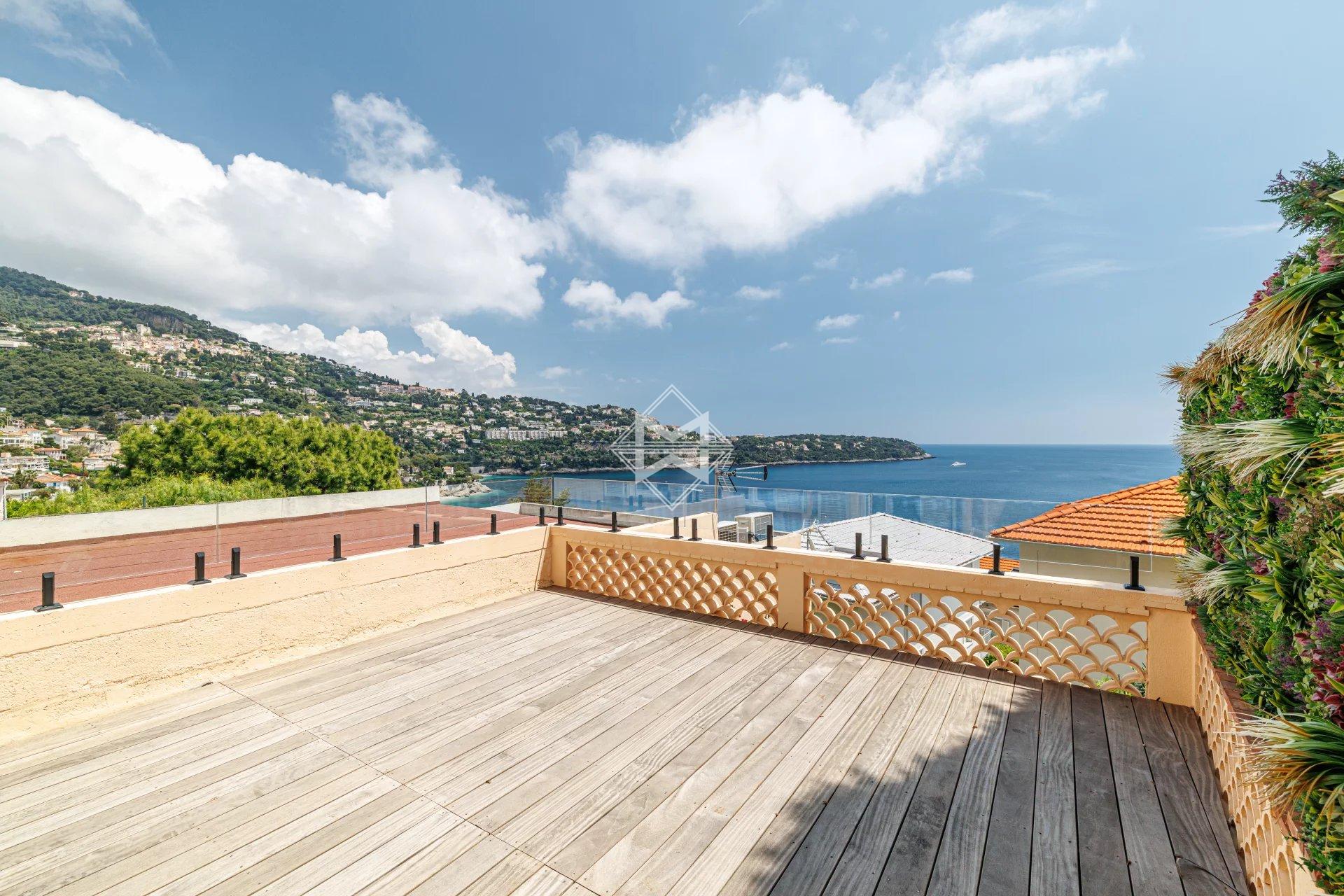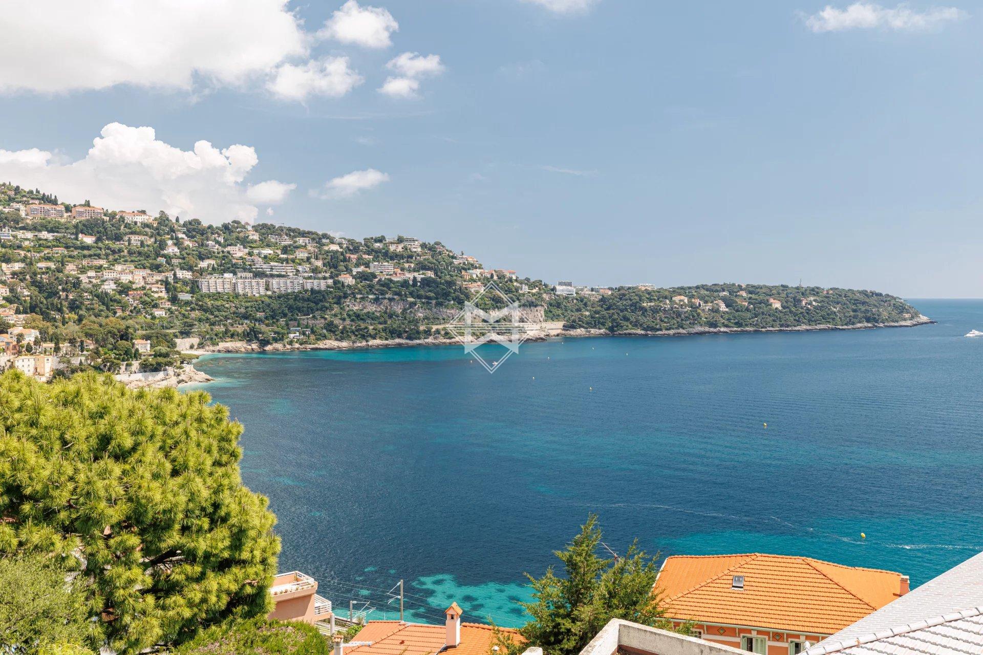 Nestled in an exceptional setting, this fully renovated house seamlessly combines authenticity with contemporary comfort. It is divided into two independent apartments, each offering stunning sea views. The main apartment, a bright two-bedroom duplex, features a spacious living room with a semi-open kitchen that opens onto a sunny terrace facing Cap Martin. Upstairs, two comfortable en-suite bedrooms also offer beautiful sea views. A laundry room, a small cellar, and high-end features complete this property. A separate, perfectly arranged studio provides an ideal space for hosting guests or rental opportunities. It also benefits from a private terrace with breathtaking sea views. A third, convivial terrace allows for the installation of a jacuzzi or a barbecue area, perfect for enjoying the outdoor setting. A secure, enclosed garage for rent is available just 10 meters away, with the option to rent a second parking space. Agency fees payable by vendor