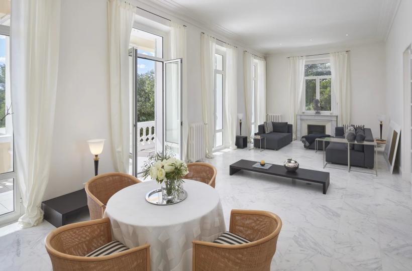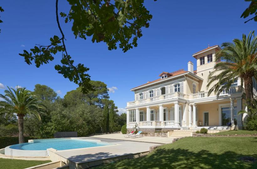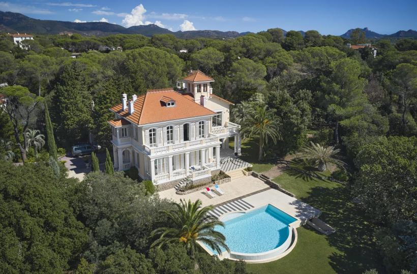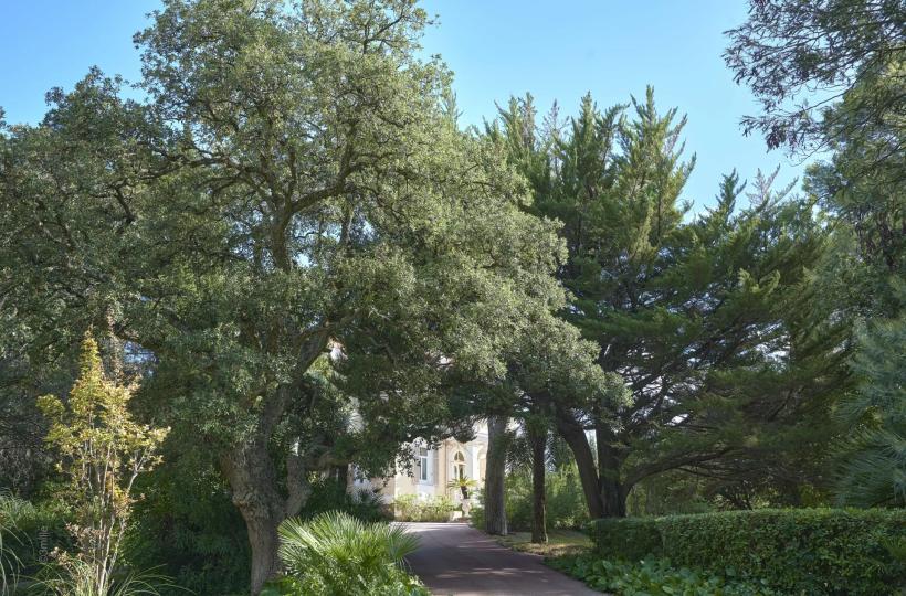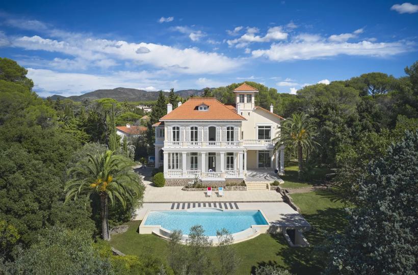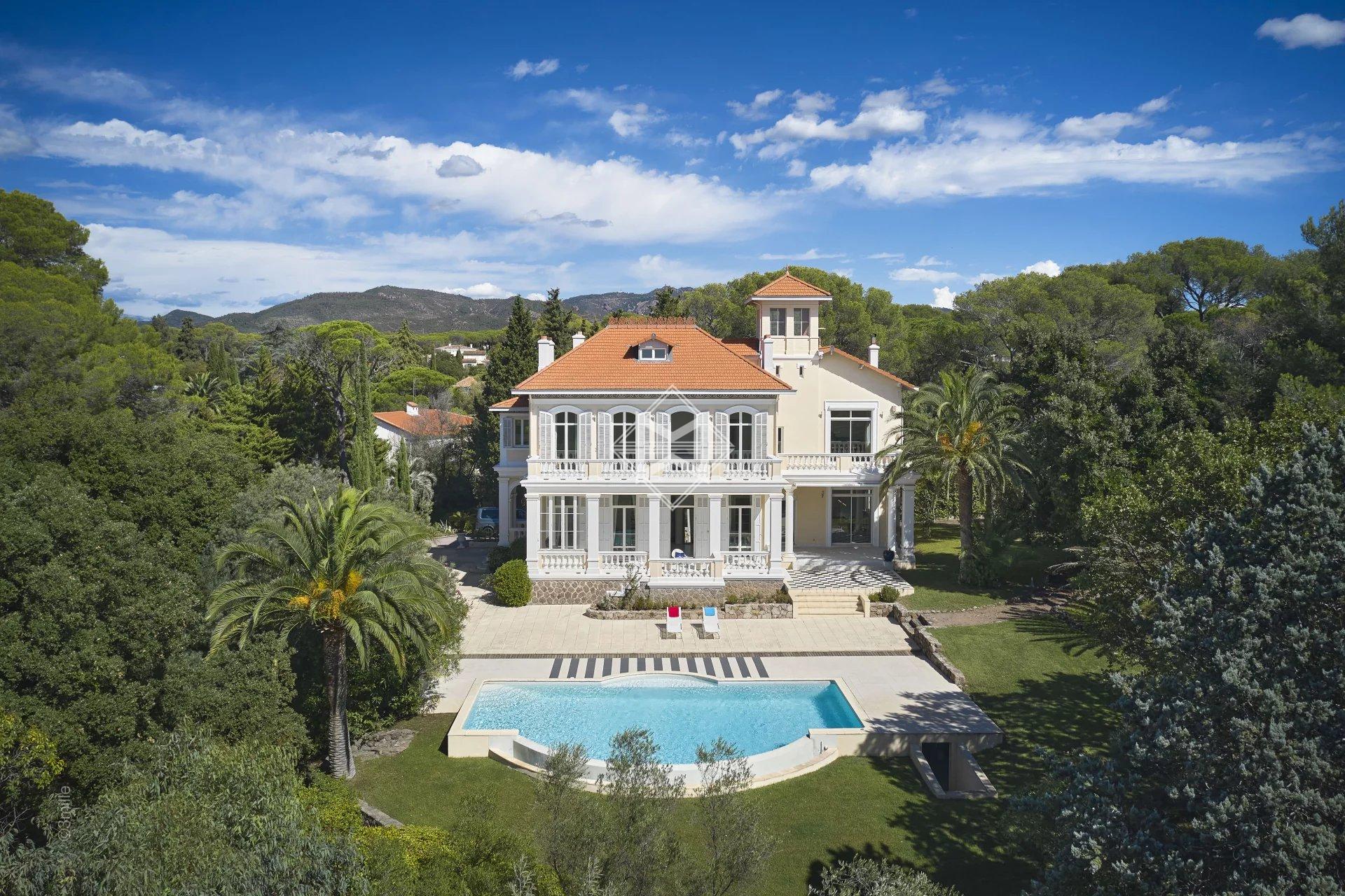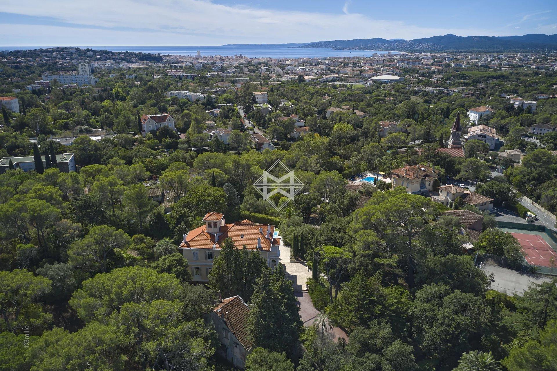 In the heart of the historic district of Valescure, this palladian-style villa attributed to architect Pierre Aublé is a remnant of the glorious period in Saint-Raphael at the end of the 19th century. Ideally located 8 minutes from the Old Port and 2 minutes from the golf courses, the property offers discreet luxury in a park of 8,828 square meters planted with cork oaks, phoenix and washingtonia palm trees, cedars and cypresses.
