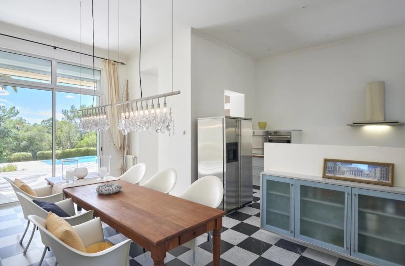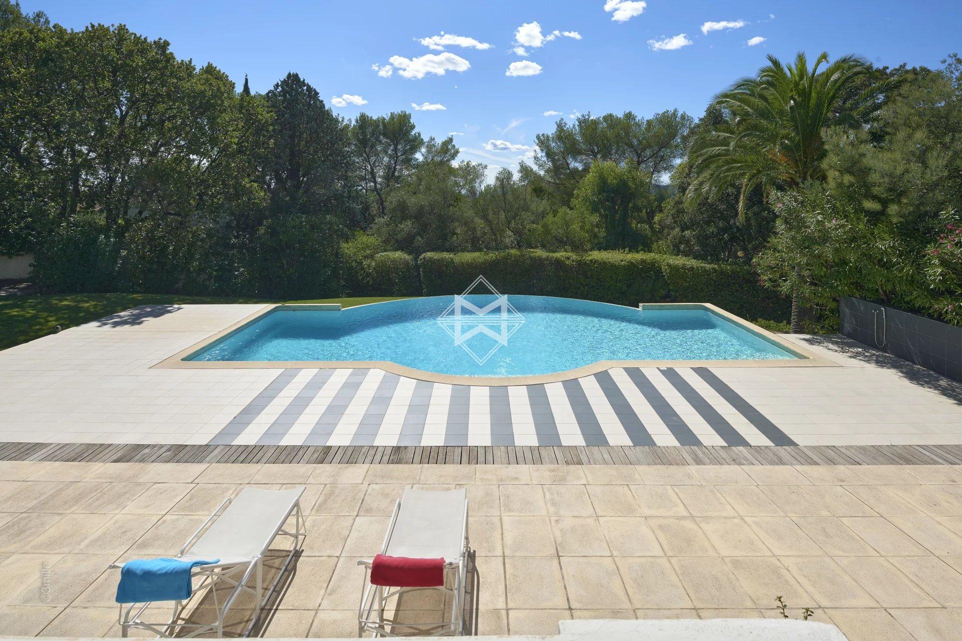 On the ground floor, the entrance hall leads to a large south-facing living room, a guest bedroom with its shower room, a library and the kitchen with its dining area which opens onto a covered terrace. On the south side, the gallery that borders the large living room with its square pillars with Tuscan capitals leads to a terrace from which you have a view of the sea, the Argens plain and the Maures mountains. The upper floor is composed of 3 bedrooms, 2 bathrooms and a large study which open onto two large terraces. The study offers beautiful volumes and could easily be rearranged as a bedroom or a suite according to your desires.