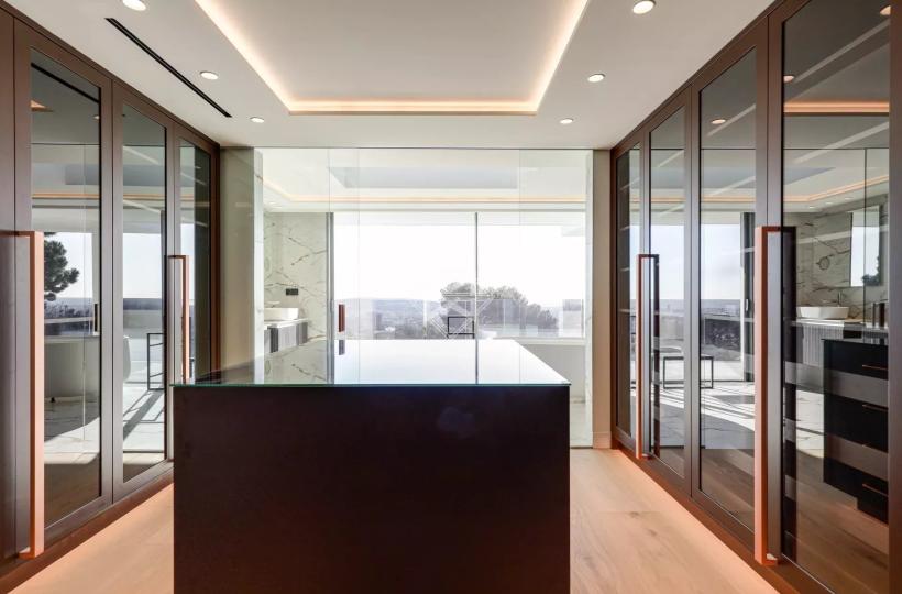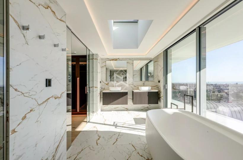 On the top floor, there is a luxurious master suite, notable for its generous space and high-quality finishes, with a double en-suite bathroom and a walk-in closet with a central island.
