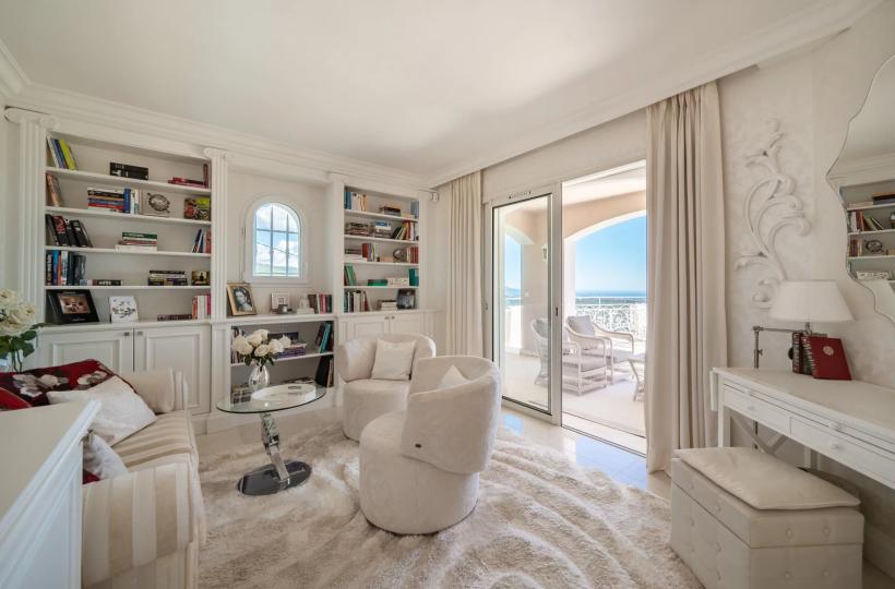 On the ground floor, a welcoming entrance hall opens onto a bright and beautiful living room with fireplace, the dining room and a modern open-plan kitchen, all opening onto a large south-facing terrace with sea views. A guest toilet and gym complete this level. A beautiful staircase leads to the first floor, which has two bedrooms with en suite bathrooms and a large study that can be converted into an additional double bedroom, while a second staircase leads to the garden level.