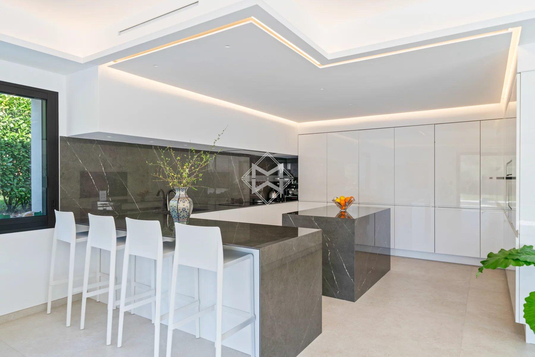 The villa comprises a beautiful entrance hall, a large reception room, a spacious modern kitchen opening onto the dining room, five magnificent en-suite bedrooms connecting to the terraces + two large offices. You will benefit from new features such as home automation, reversible air conditioning, a large swimming pool, and more.